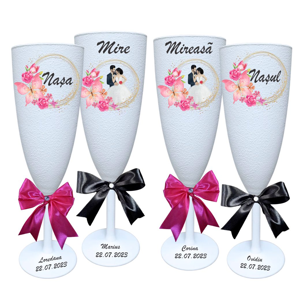 Set 4 Pahare Personalizate, Nunta, Miri, Nasi, Alb, PHRP033