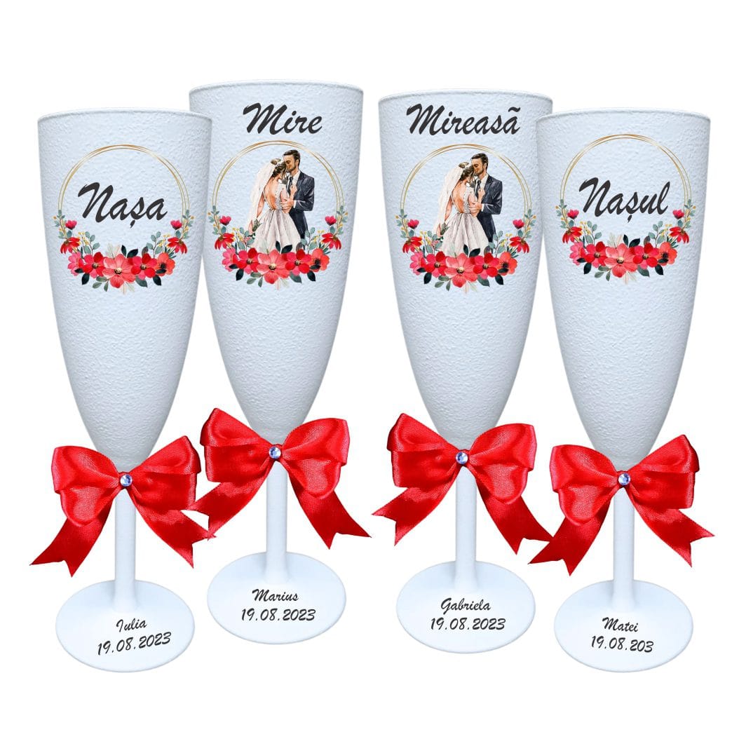 Set 4 Pahare Personalizate, Nunta, Miri, Nasi, Alb, PHRP041