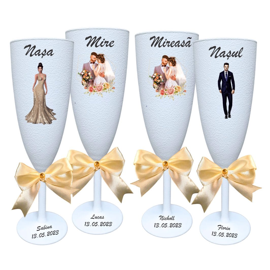 Set 4 Pahare Personalizate, Nunta, Miri, Nasi, Alb, PHRP009