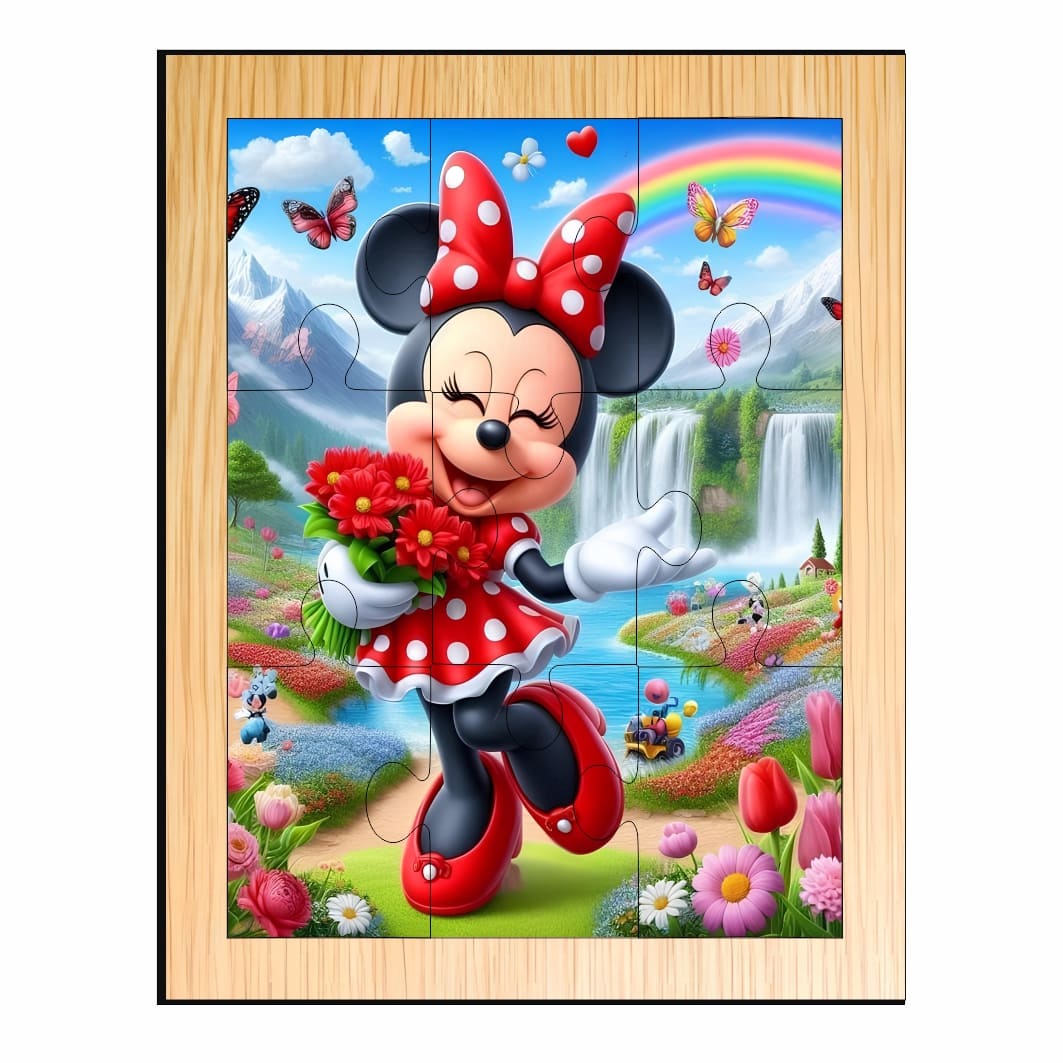 Puzzle din lemn, Minnie Mouse, 9 piese, Multicolor, 15×12 cm, PDUV068