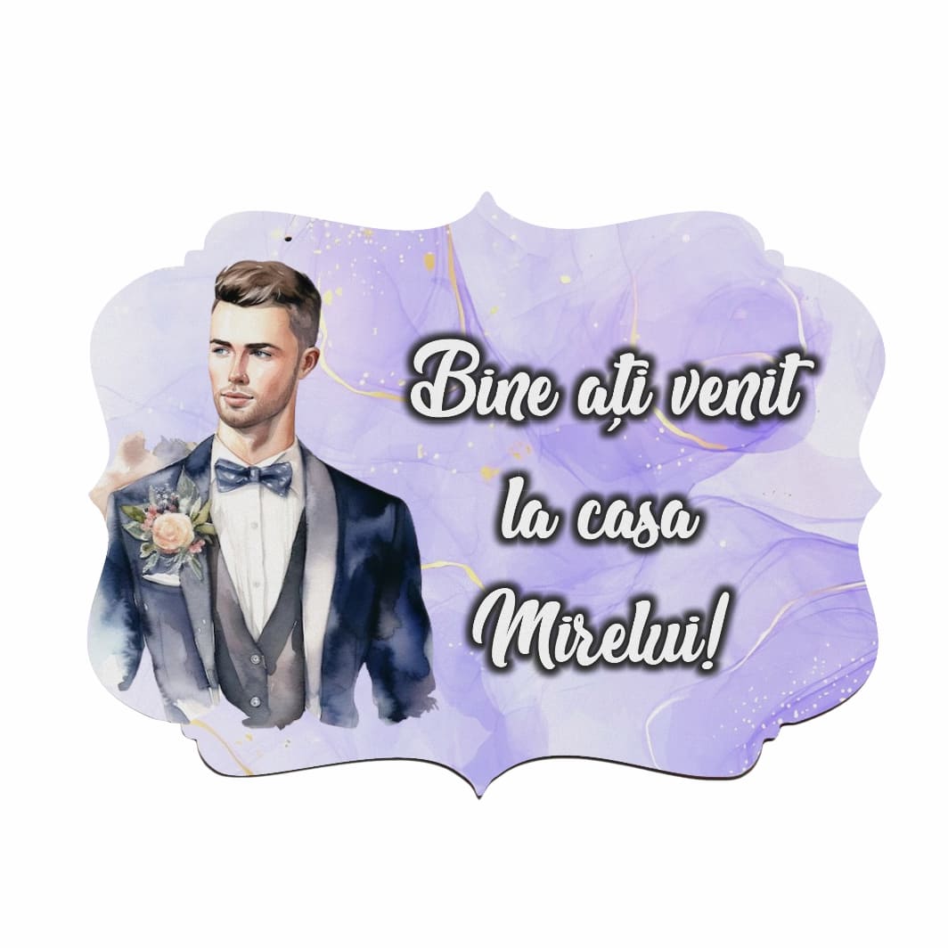 Pancarta Bine Ati Venit la casa Mirelui, Nunta, Mov, 40x31cm, PBUV005