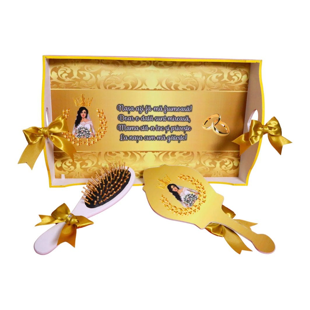 Set Gatitul Miresei, Nunta, 3 Piese, Lemn, Auriu, 22x35cm, SGMRSD003
