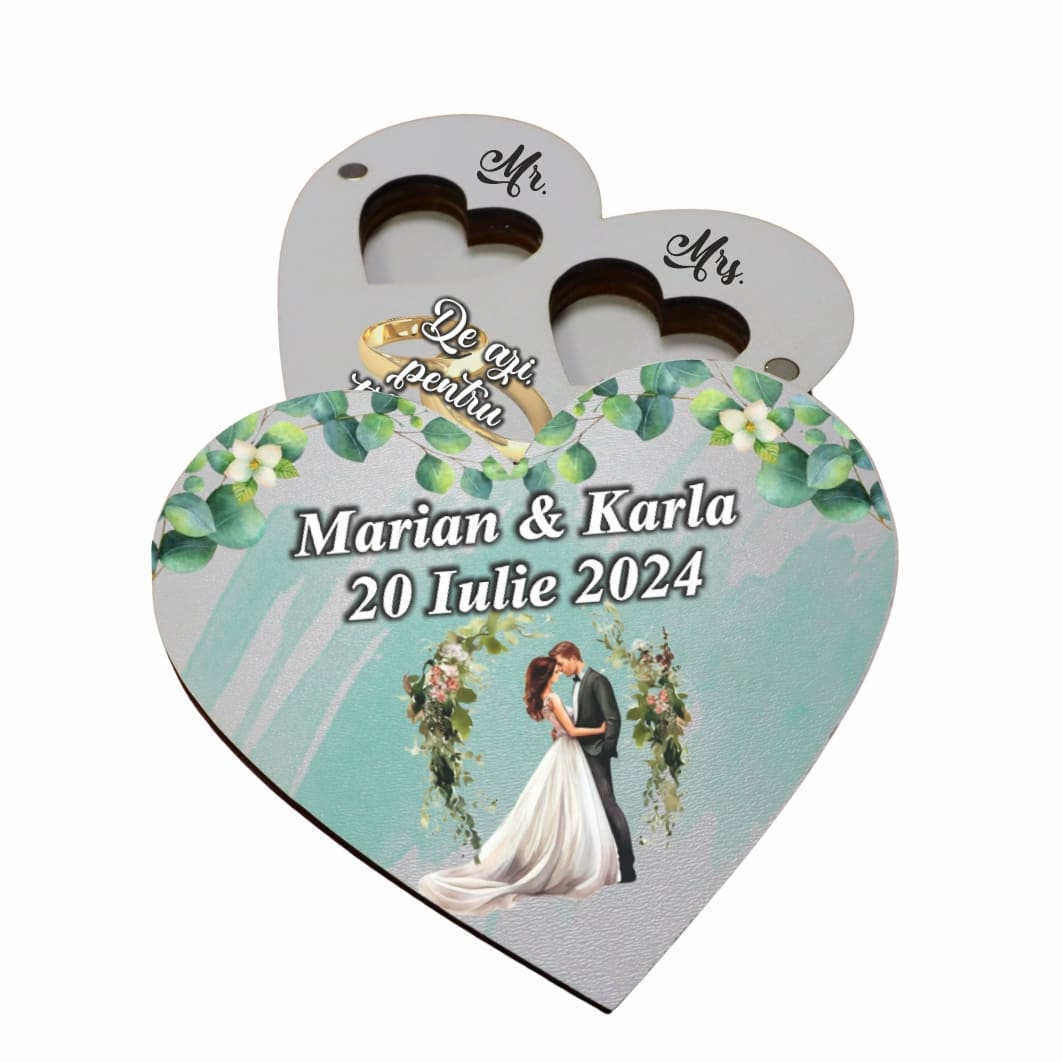 Cutie de verighete cu magnet, Personalizata, Inima, Verde, Lemn, CTV046