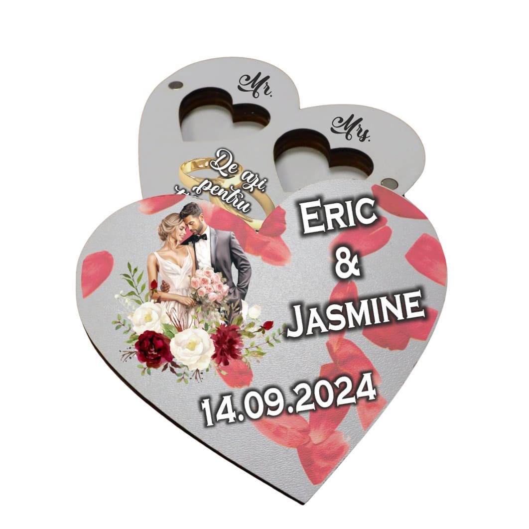 Cutie de verighete cu magnet, Personalizata, Inima, Rosie, Lemn, CTV042