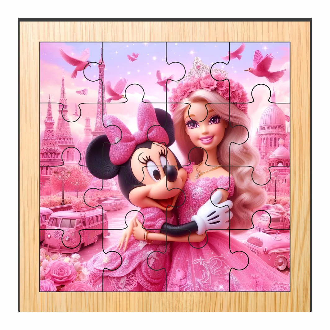 Puzzle din lemn, Minnie Mouse, Barbie, 16 piese, Multicolor, 17×17 cm, PDUV019