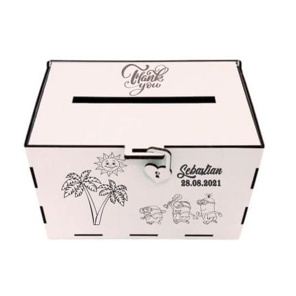 Cutie de bani pentru botez, Minioni, Lemn, 30x20x20 cm, Alb