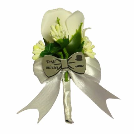 Cocarde Nunta, Model Papion Floral, Trandafir, Argintiu-Alb, CFL014