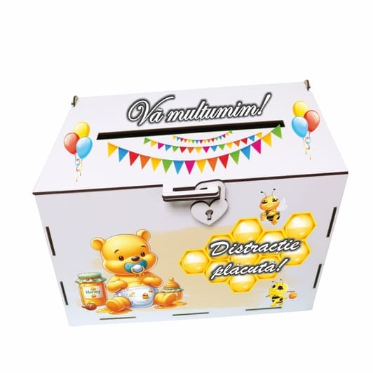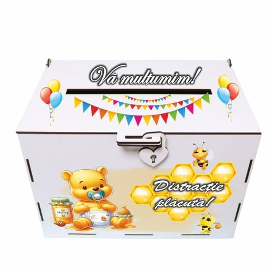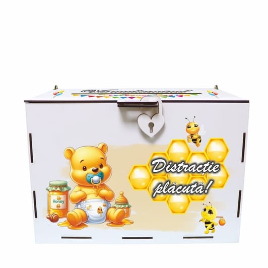 Modelul Winnie The Pooh îmbină designul jucăuș cu un finisaj premium, astfel încât masa de dar să arate impecabil. Dimensiunile de 30x20x20 cm oferă spațiu pentru