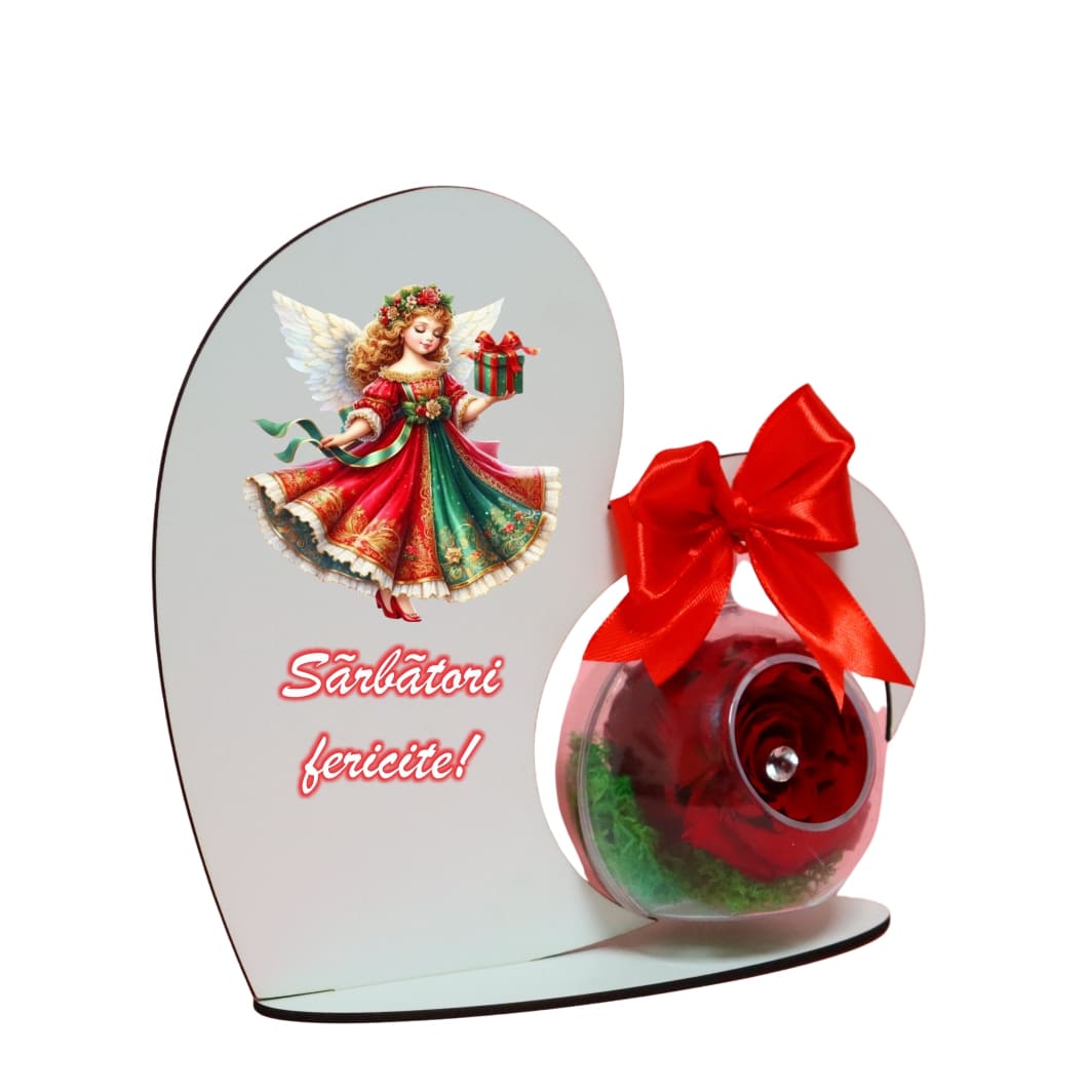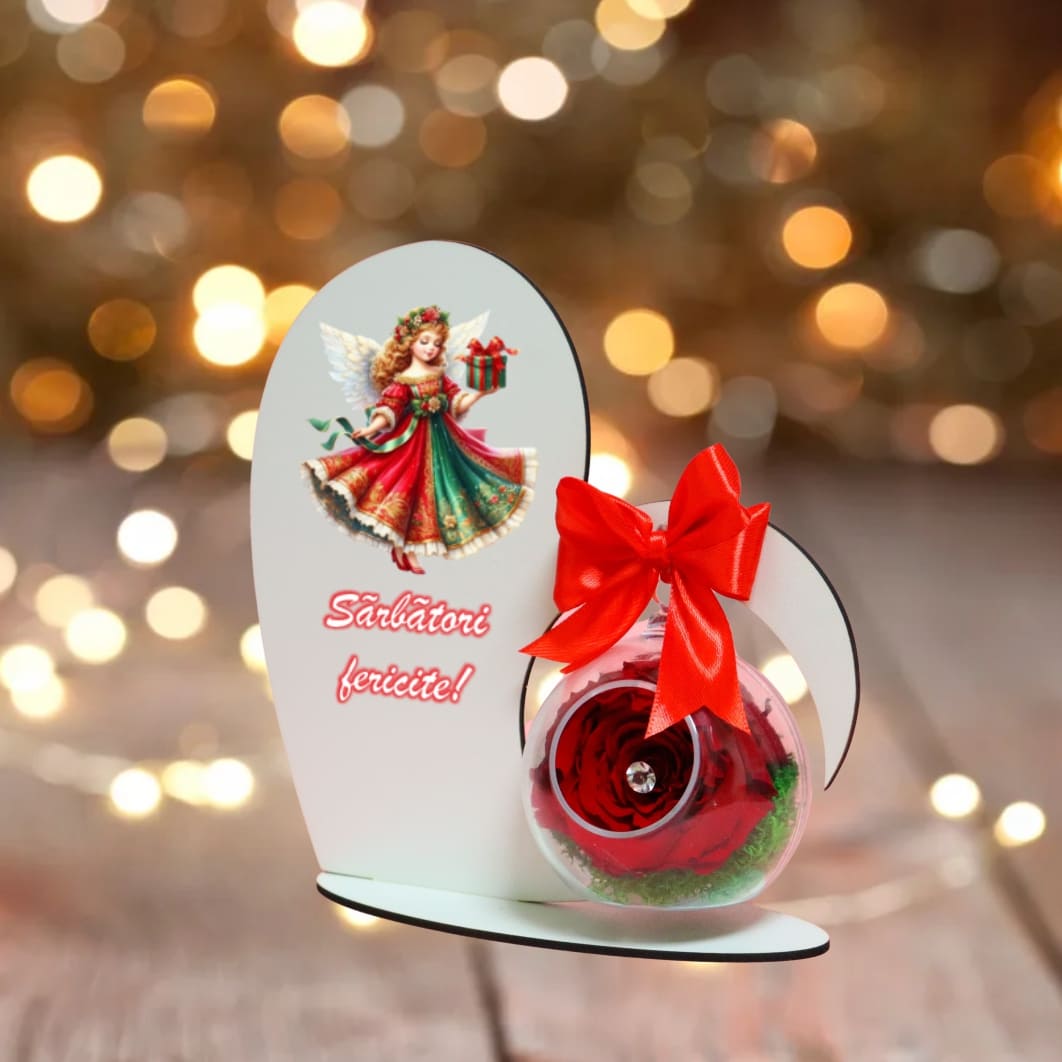 Suport in forma de inimă din lemn colorat prin print UV cu glob, trandafir criogenat rosu si licheni verzi.