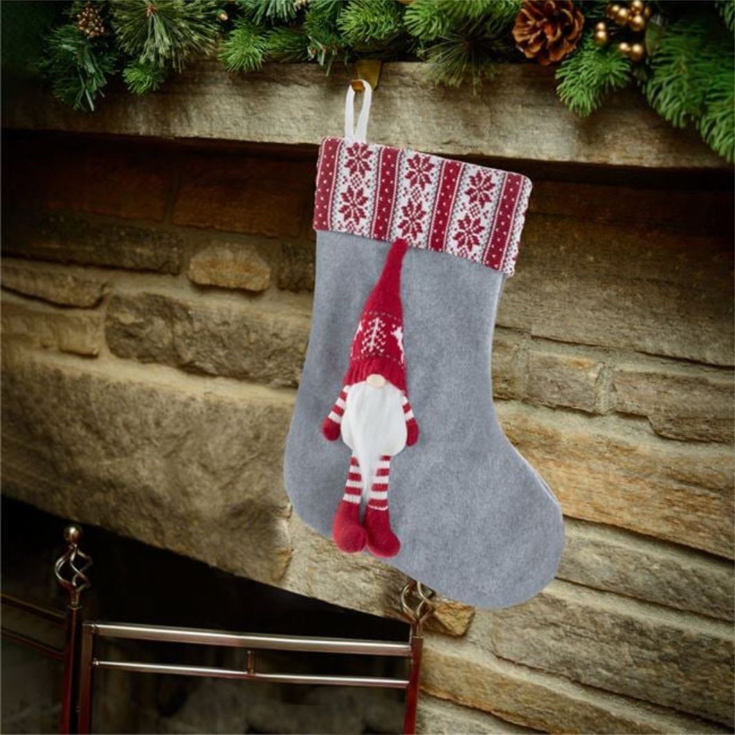 Cizma decorativa de Craciun, gri, cu imprimeu jacquard tricotat alb si Gnome 3D, cu caciula rosie tricotata si picioare suspendate.