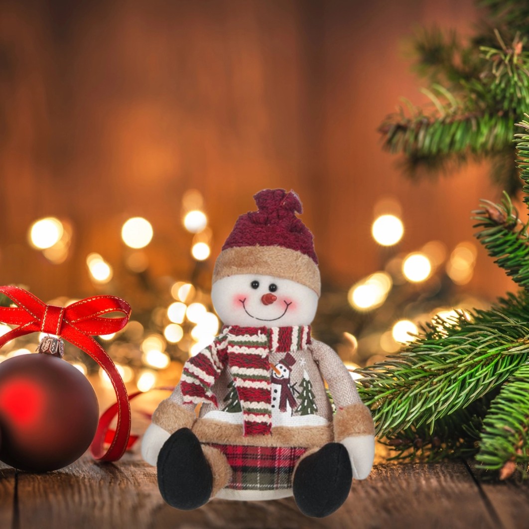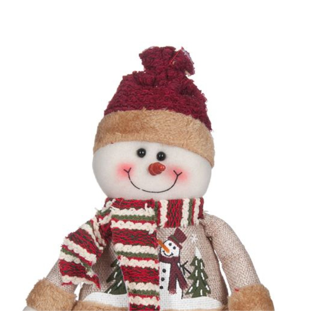 Figura decorativa de craciun om de zapada cu caciula rosie cu blana bej si fular cu dungi. Combinati diferite figuri sau de acelasi tip pentru o decorare speciala! Lumea magica a Craciunului!