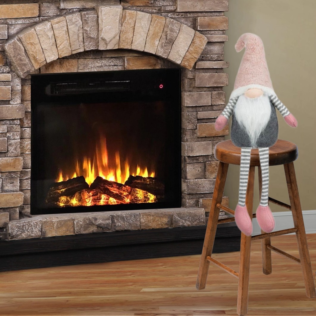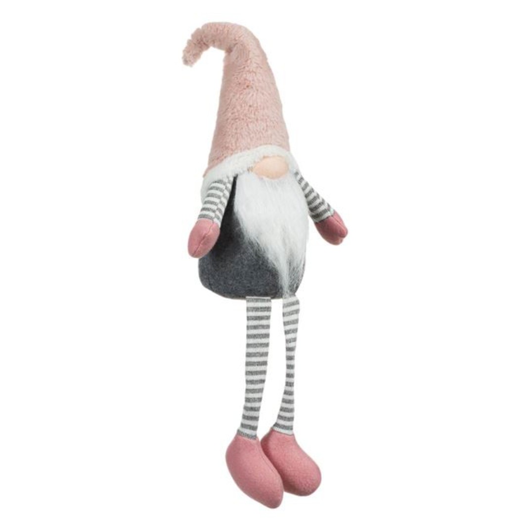 Figura decorativa Gnome de Craciun, cu haina gri, caciula roz de blana si barba lunga. Este asezat si picioarele lungi sunt suspendate.