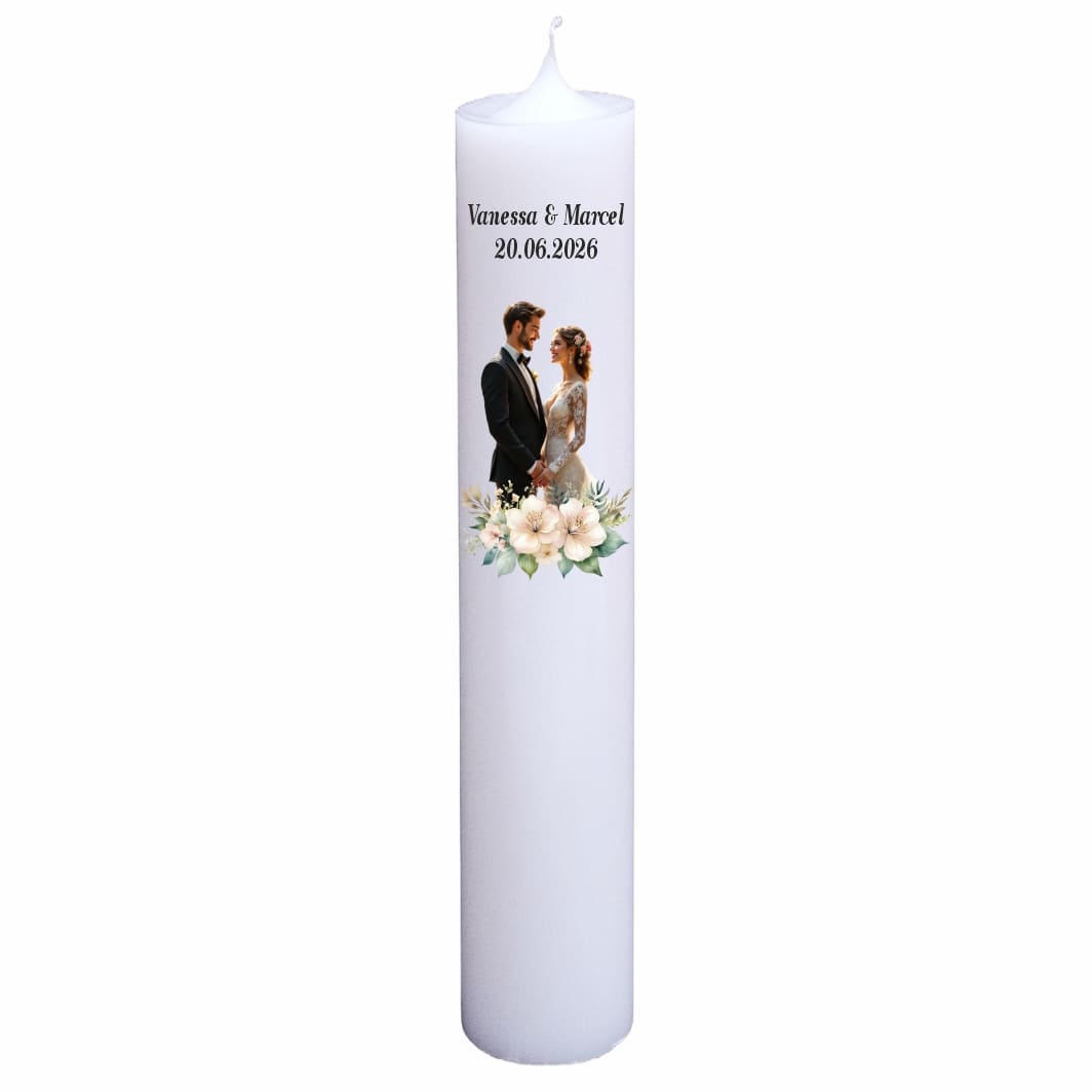 Aceasta lumanare personalizata nunta este conceputa pentru a adauga eleganta si emotie in timpul cununiei religioase. Modelul LN053 are o inaltime de 35 cm, este realizat pe suport alb si grafica cu miri si flori crem. Se livreaza la 1 bucata si poate fi personalizata pentru a reflecta unicitatea mirilor.