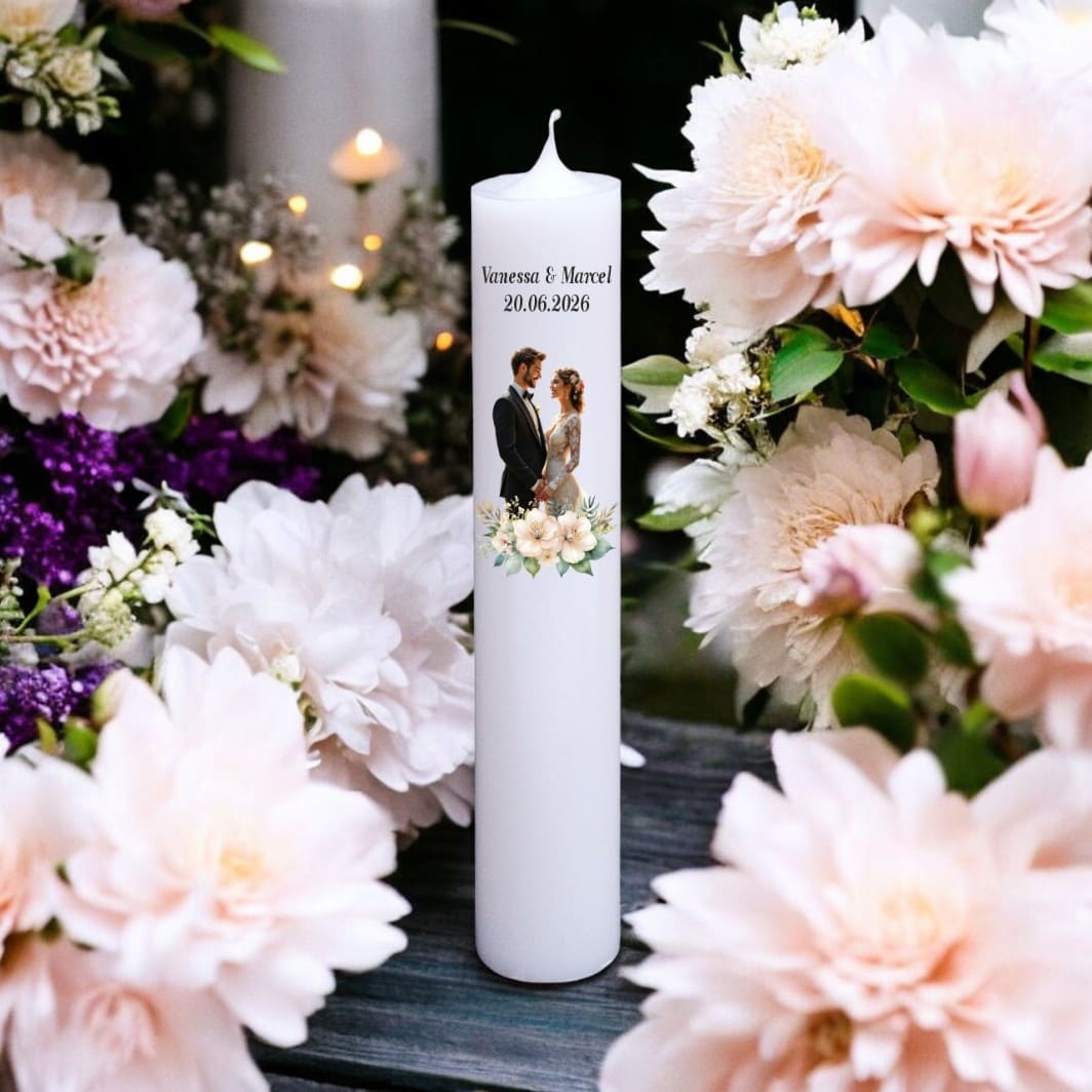 Aceasta lumanare personalizata cu miri si flori crem simbolizeaza speranta si echilibrul, in timp ce albul reprezinta puritate si un nou inceput. Impreuna, creeaza un obiect de mare insemnatate pentru ceremonia de nunta. Personalizarea ofera posibilitatea de a adauga numele mirilor sau data evenimentului, transformand lumanarea intr-o amintire deosebita.