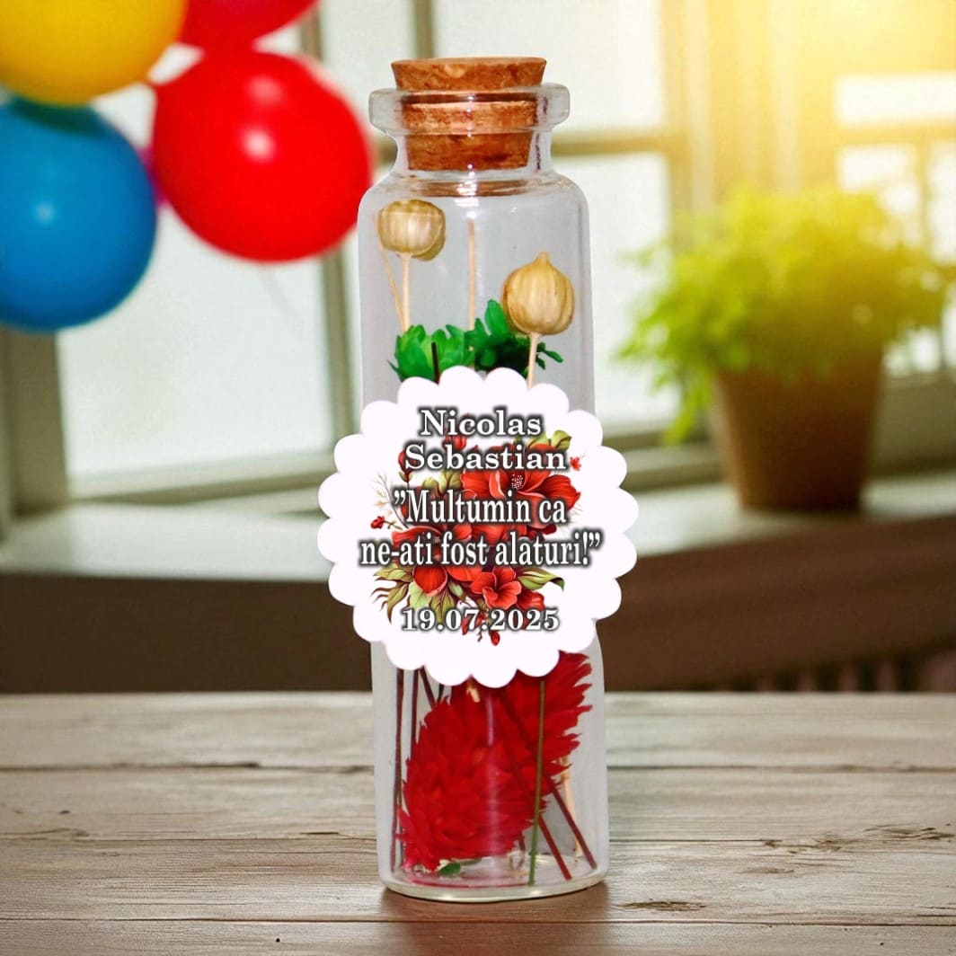dintr-o sticluță delicată, umplută cu flori uscate naturale, atent alese pentru a transmite puritate și iubire.