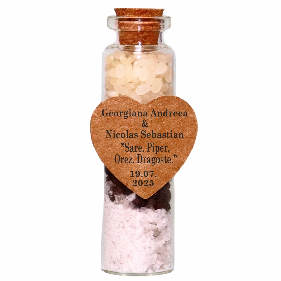 Alege să oferi invitaților tăi un cadou care spune o poveste și care rămâne în sufletele lor mult timp după încheierea nunții. Sticluta cu sare, piper și orez, personalizata cu numele mirilor și data evenimentului, este alegerea ideală pentru cei care apreciază detaliile și valoarea simbolică a fiecărui element.