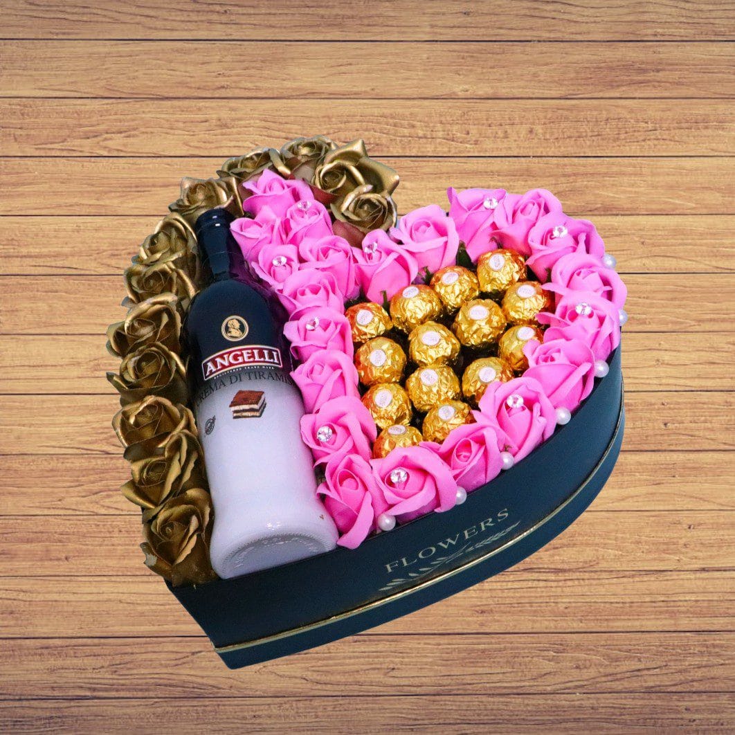 Acest aranjament floral cu bomboane si sampanie in cutie, in forma de inima, este compus din: