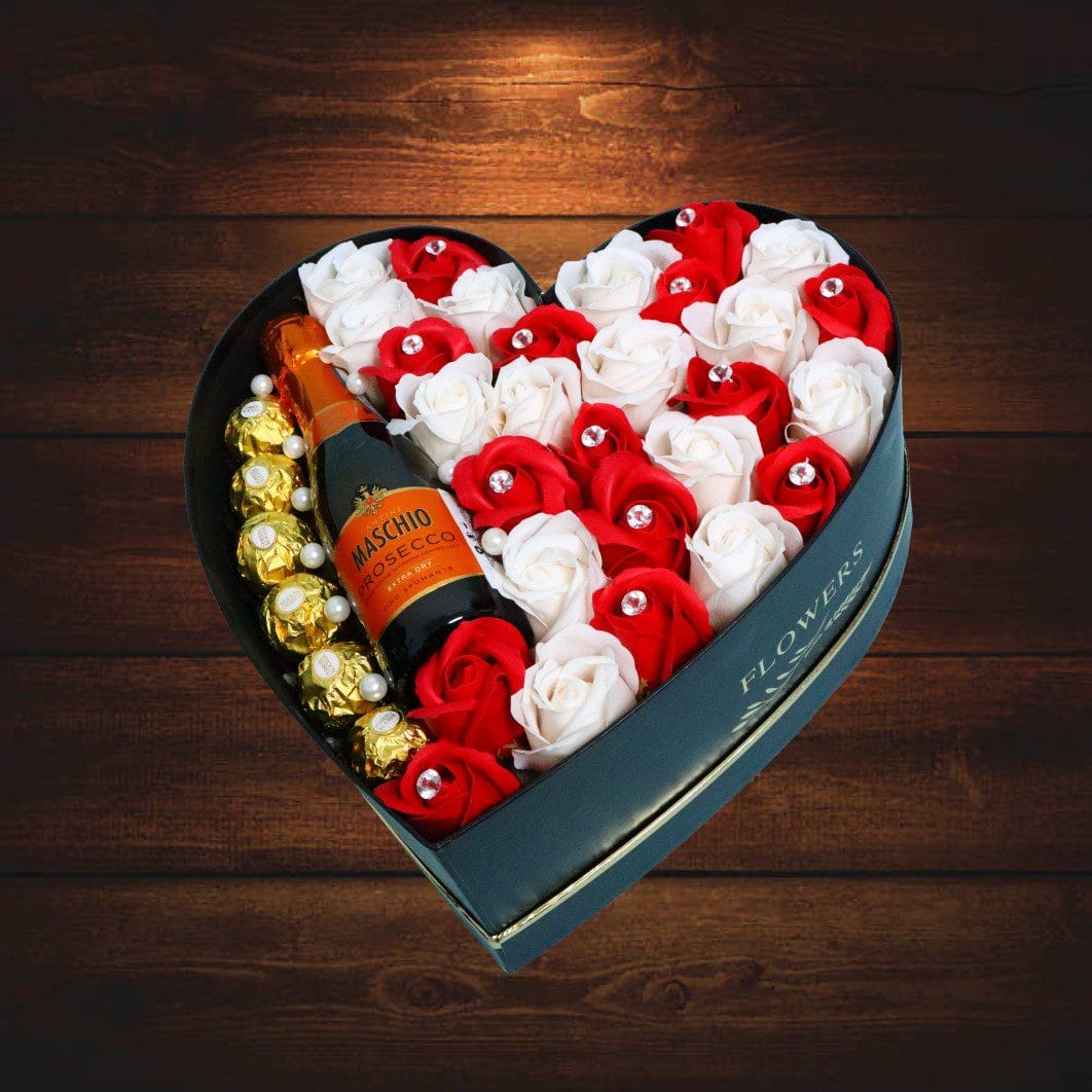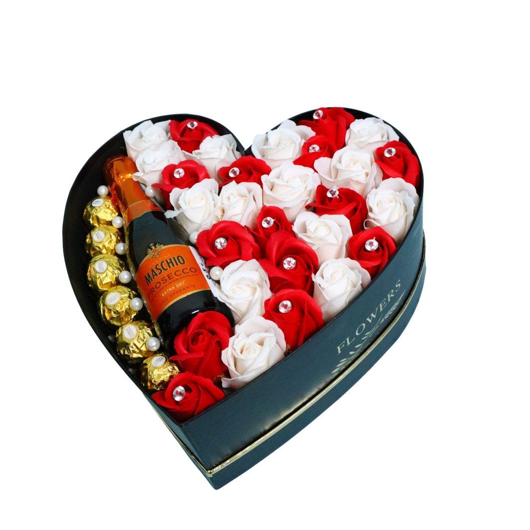 Aranjament Floral Prosecco, Ferrero, Trandafiri Sapun, Alb Rosu, 28 cm, AF012