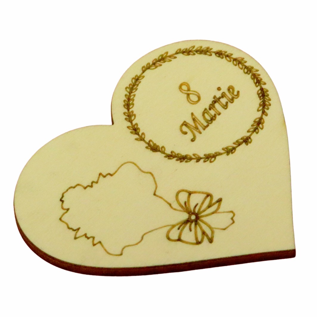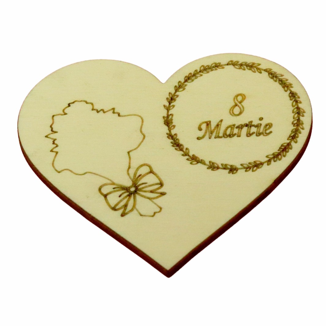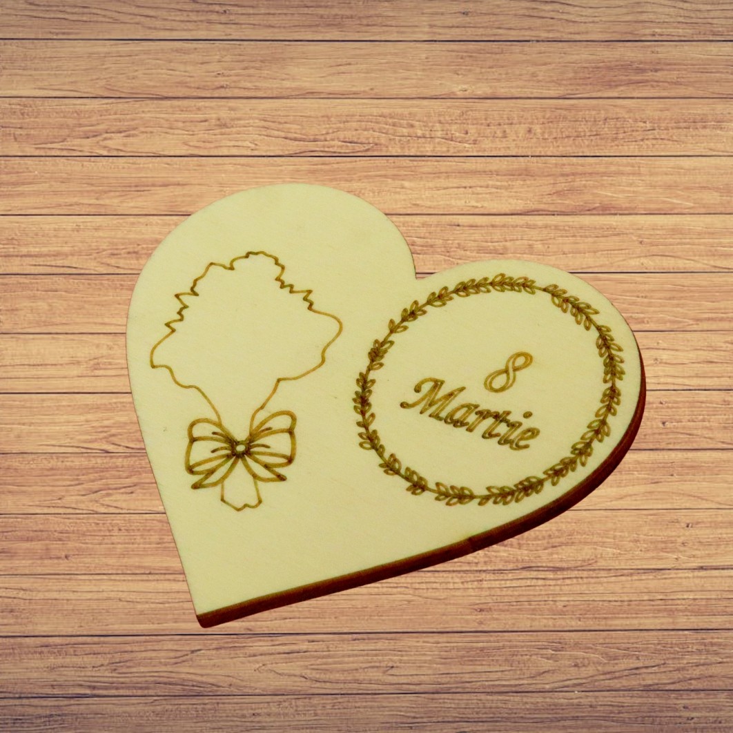 Produsul este realizat din lemn natur și are dimensiunea de 10 × 8 cm, fiind compact și ușor de utilizat ca suport pentru mărțișoare cu flori uscate. Forma de inimă adaugă un plus de sensibilitate și eleganță, transformând această bază mărțișor 8 martie într-o alegere potrivită pentru cadouri oferite mamelor, bunicilor, educatoarelor sau colegelor.
