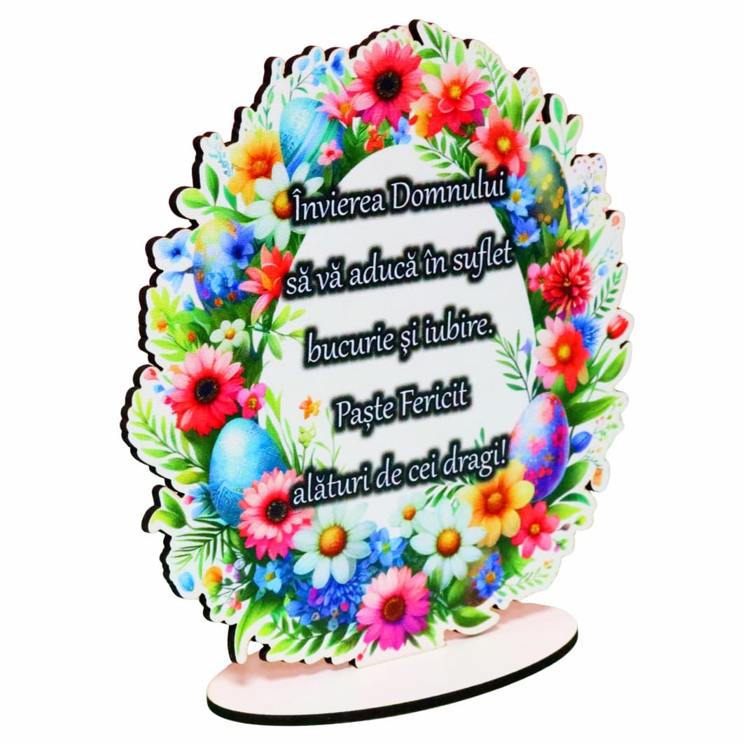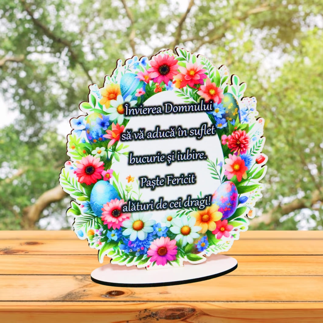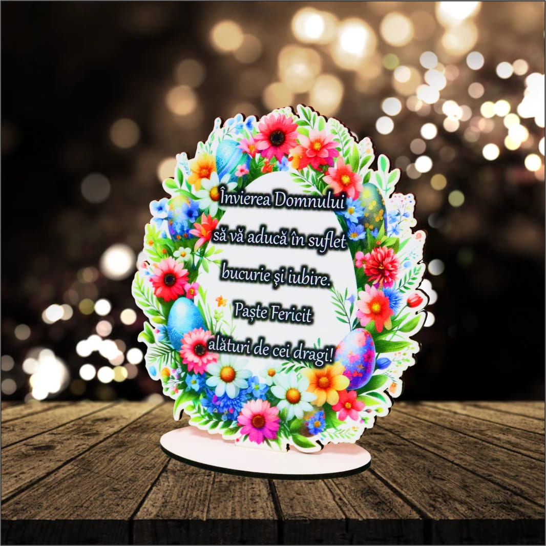 Acest cadou decorativ paste îmbină simbolurile tradiționale ale sărbătorii cu un design modern și elegant. Forma sa de coroana florală, împodobită cu flori multicolore, frunze verzi și ouă pascale în nuanțe pastelate, creează un impact vizual deosebit, fiind ideal pentru orice decor. Mesajul pascal, plasat strategic în centrul compoziției, aduce o notă de spiritualitate și emoție, făcând din acest cadou un obiect decorativ cu adevărat special.