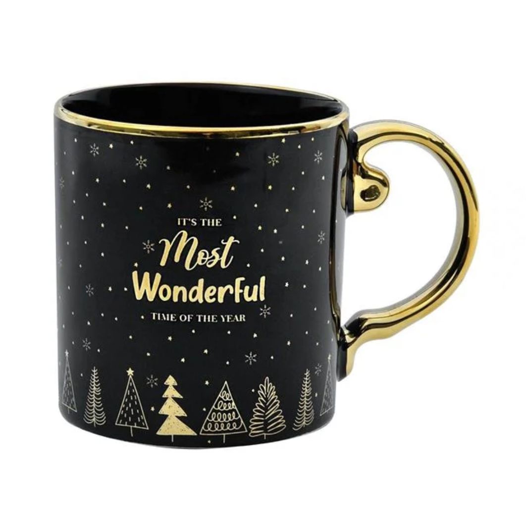 Cana de Craciun , neagra, cu maner auriu si margine, model brazi fulgi si mesaj „It’s the Most Wonderful time of the Year”.