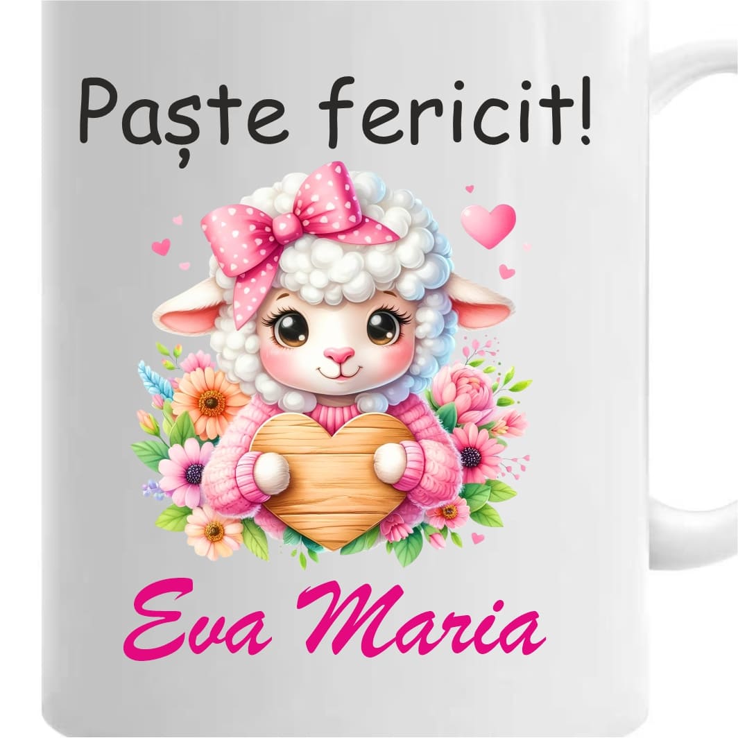 Această cana personalizata Paste este un cadou delicat și plin de farmec, perfect pentru a aduce un strop de bucurie în diminețile de sărbătoare. Realizată din ceramică albă, cu un design luminos și elegant, cana este decorată cu o oiță adorabilă îmbrăcată în nuanțe de roz, care ține o inimioară, simbol al afecțiunii și căldurii. Mesajul „Paște fericit!” și personalizarea cu numele ales transformă această cana personalizata Paste într-un obiect unic, creat special pentru a oferi emoție și zâmbete.