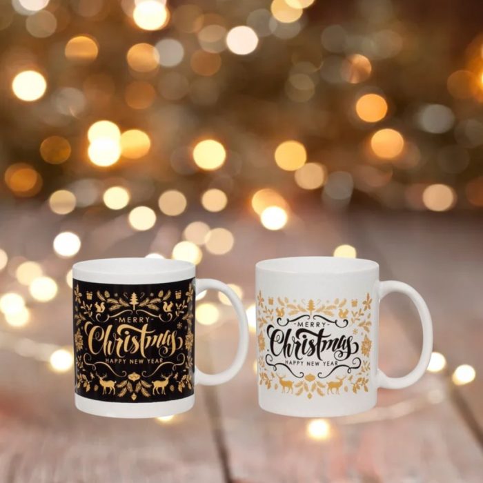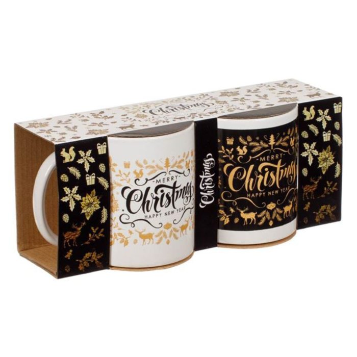 Set cani de Craciun, neagra si alba cu imagini aurii si imprimeu negru si alb Merry Christmas.