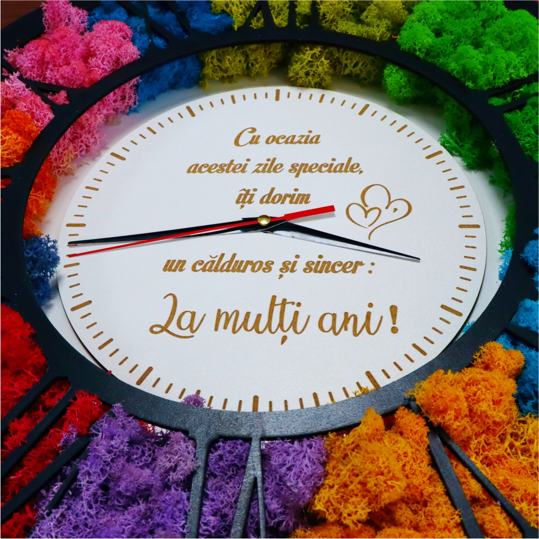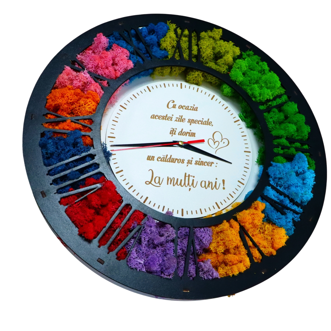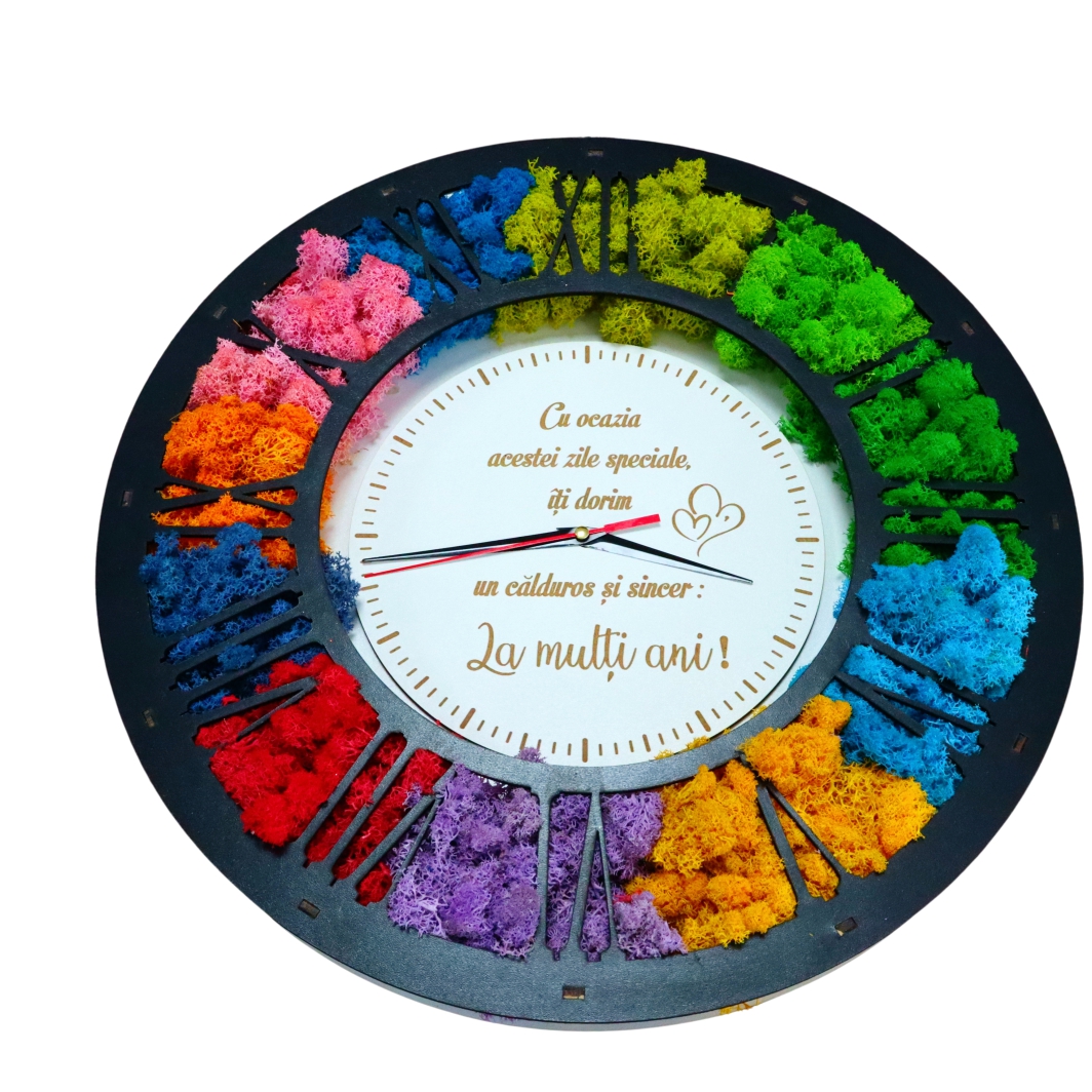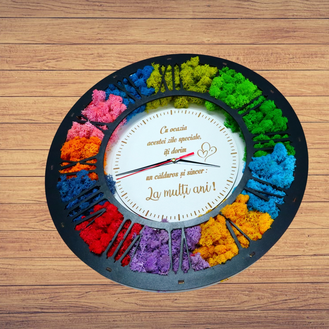 Un ceas licheni aniversare este mai mult decât un simplu obiect de măsurare a timpului, este o piesă decorativă spectaculoasă, creată pentru a marca momente speciale și pentru a aduce culoare și eleganță într-un spațiu interior. Modelul din imagine impresionează prin designul său circular modern, unde lichenii stabilizați multicolori sunt integrați armonios în jurul cadranului, oferind un efect vizual deosebit și un contrast elegant cu placa neagră a cifrelor și fundalul alb al cadranului central.