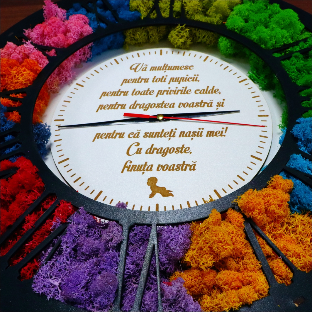 Ceas din lemn cu mesaj pentru nasi si decorat cu licheni.