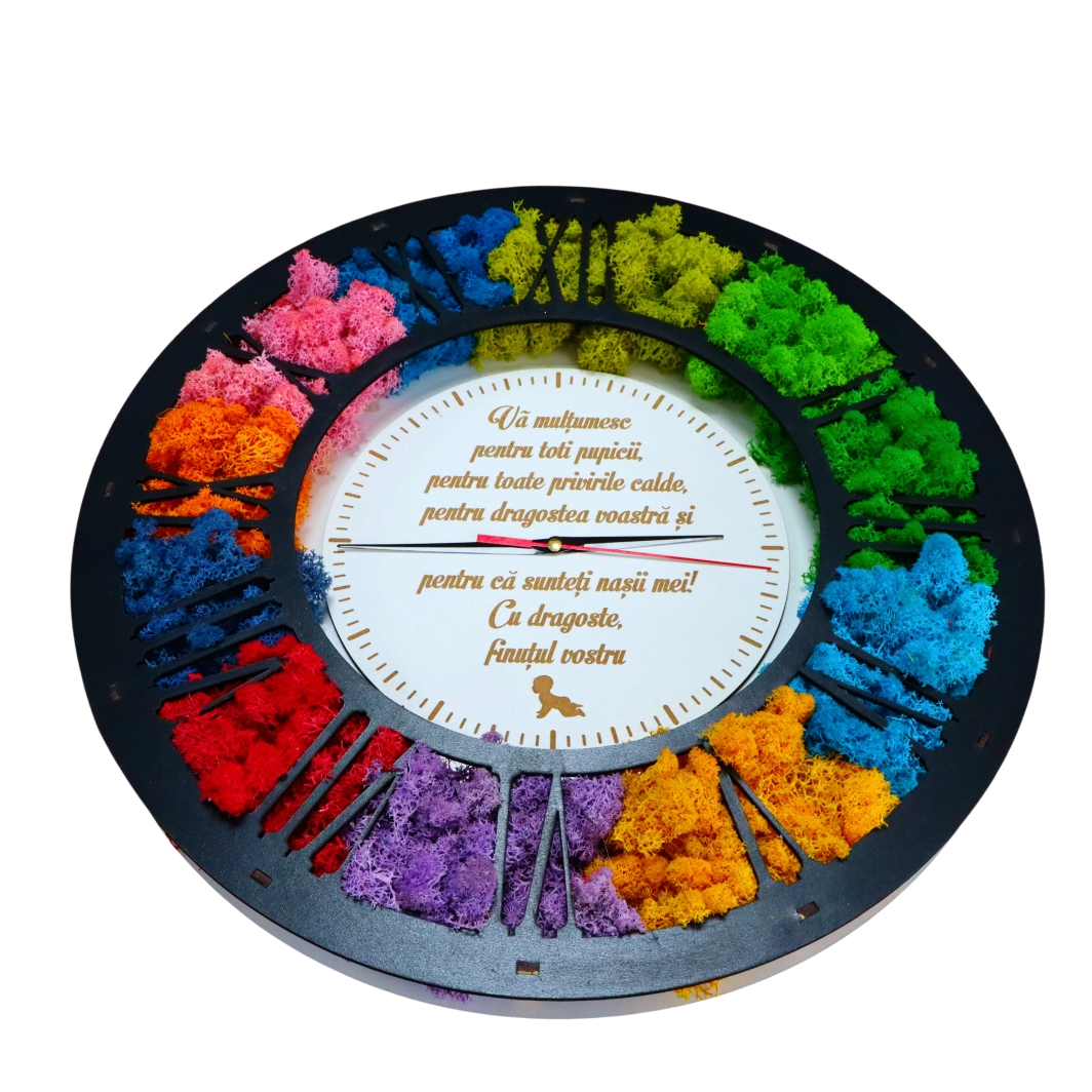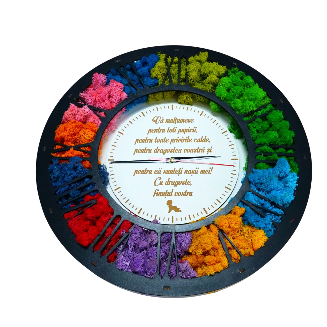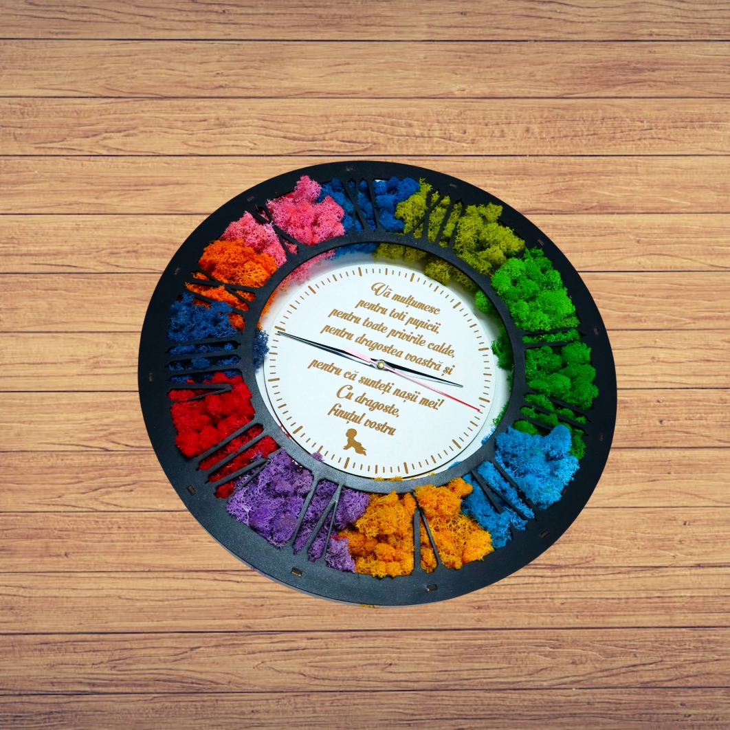 Ceas din lemn cu mesaj pentru nasi si decorat cu licheni.