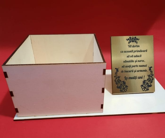 Structura solidă din lemn asigură stabilitate aranjamentelor și o prezentare estetică impecabilă. Placheta amplasată în partea din față transformă fiecare creație într-un cadou unic, personalizat și încărcat de emoție. Această cutie aranjamente florale este ideală pentru decoruri de birou, camere de zi, recepții, vitrine sau spații dedicate evenimentelor speciale. Poate fi completată cu accesorii decorative, panglici, licheni, flori uscate sau elemente tematice, adaptându-se cu ușurință oricărui stil estetic.