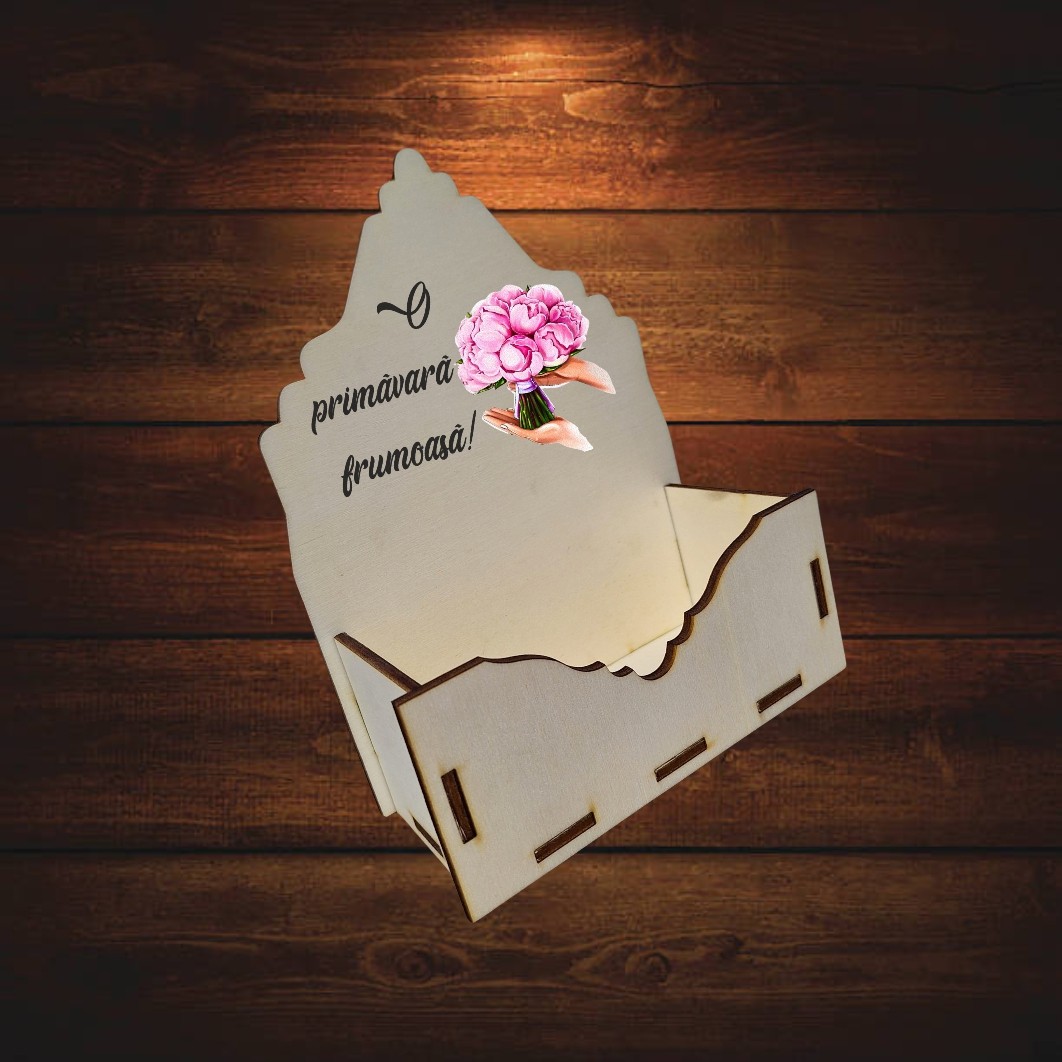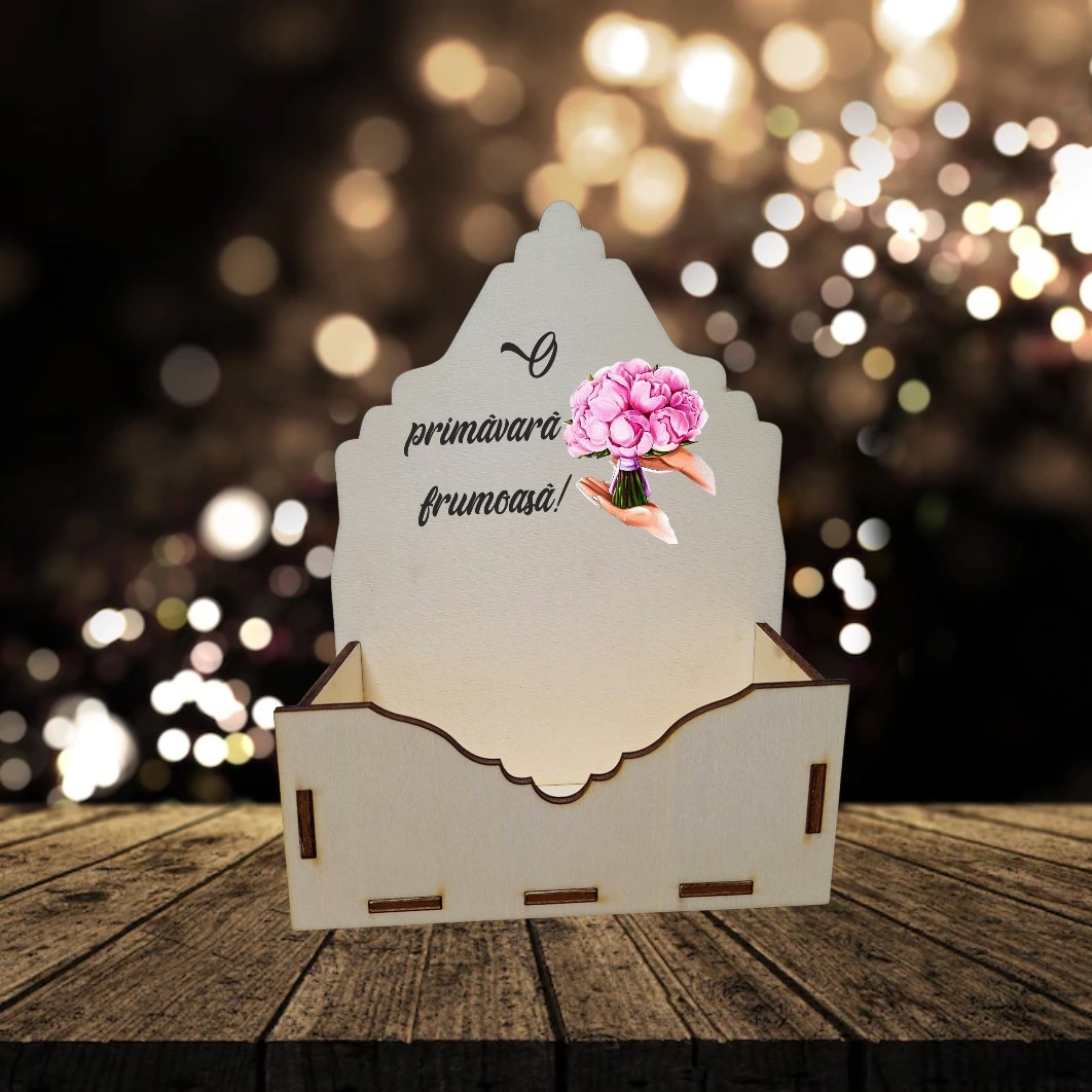 Fabricată din lemn rezistent, cutia oferă stabilitate și un aspect natural care pune în valoare florile și accesoriile decorative. Designul vertical facilitează expunerea aranjamentelor florale, făcându-le ideale pentru a fi așezate pe birou, într-un spațiu de lucru, pe o masă festivă sau într-un decor de primăvară. Mesajul „o primăvară frumoasă” completează armonios estetica cutiei, transformând orice proiect floral într-un cadou plin de lumină, optimism și culoare.
