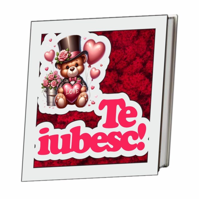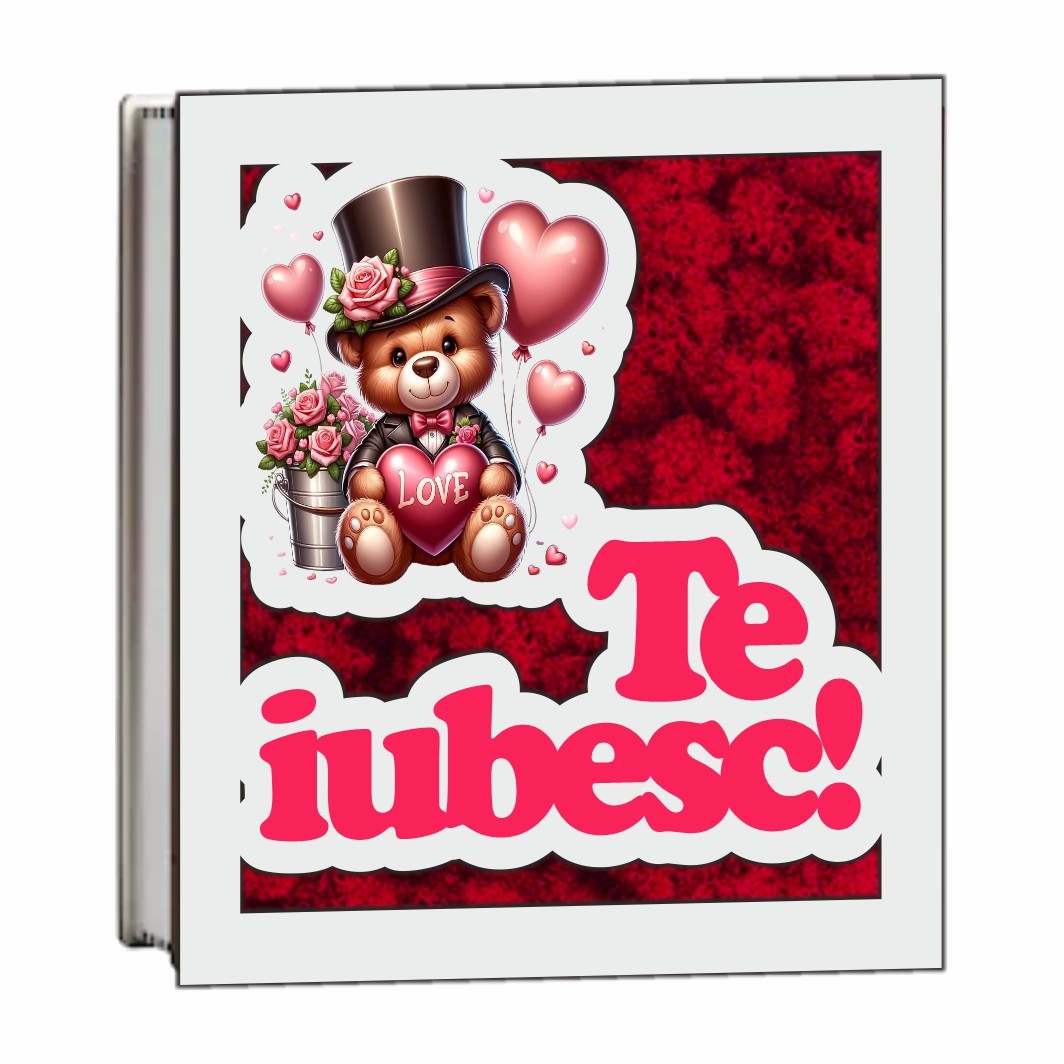 Această cutie aranjamente licheni este o decoratiune modernă și expresivă, realizată pentru a transmite emoție, afecțiune și căldură printr-un design atent lucrat. Decorul este completat de un element grafic în model urs, alături de mesajul „Te iubesc”, creând un obiect decorativ cu impact vizual și semnificație emoțională puternică. Culoarea roșie a lichenilor stabilizează adaugă intensitate și transformă această piesă într-un accent decorativ ideal pentru spații personale sau pentru a fi oferită cadou.