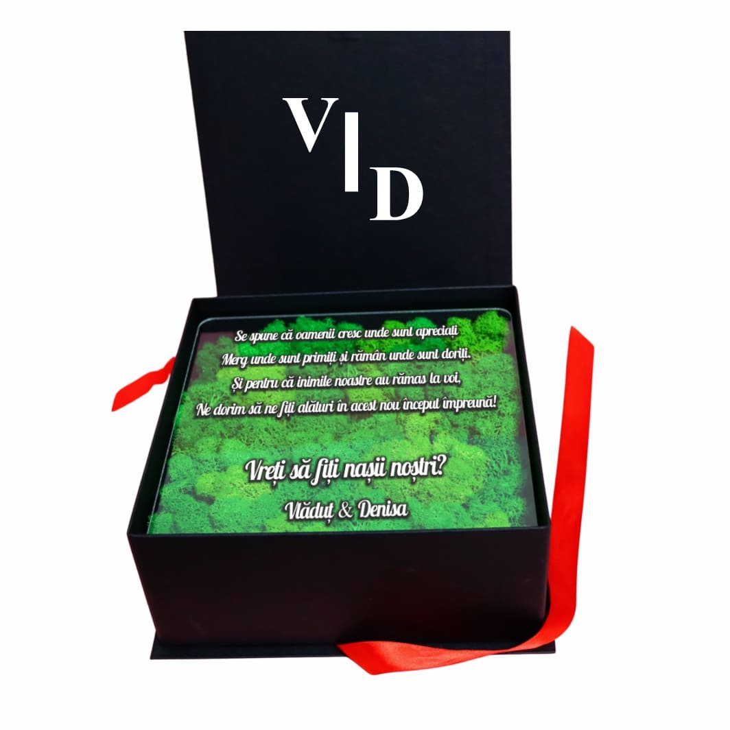 Decoratiune cadou  cu mesaj personalizat pentru cerere nasi si decorata cu licheni naturali stabilizati.