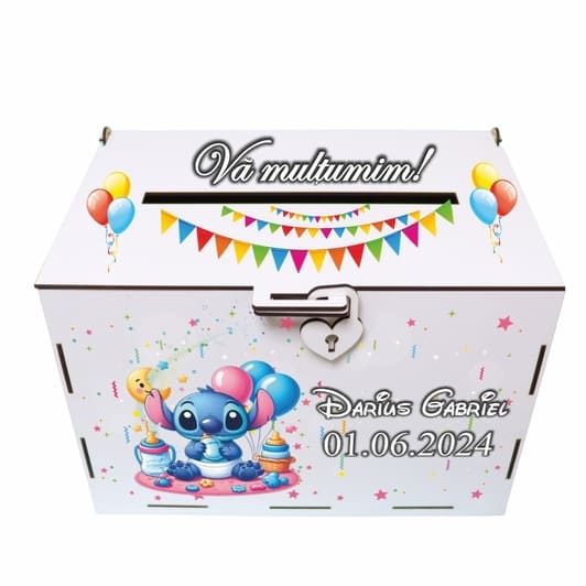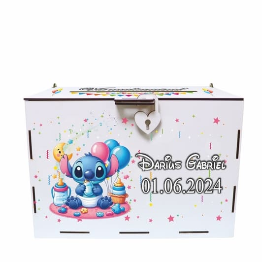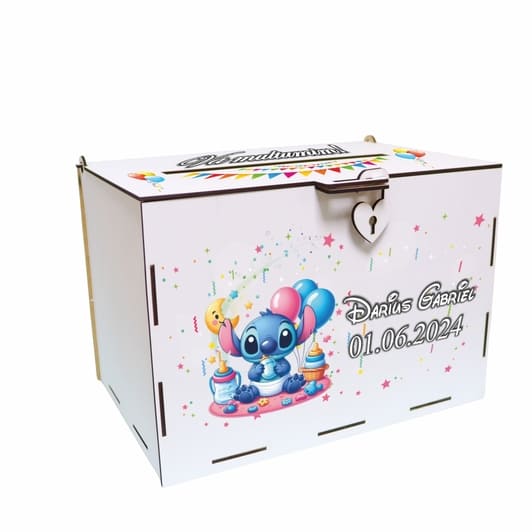 Alege Cutia Dar Botez, Personalizata, Stitch, Bebe, Lemn, 30x20x20 cm, CDBUV006 pentru un eveniment plin de zâmbete, culoare și emoție. Cu un design adorabil și detalii impecabile, va deveni cu siguranță piesa centrală a decorului de botez! ✨