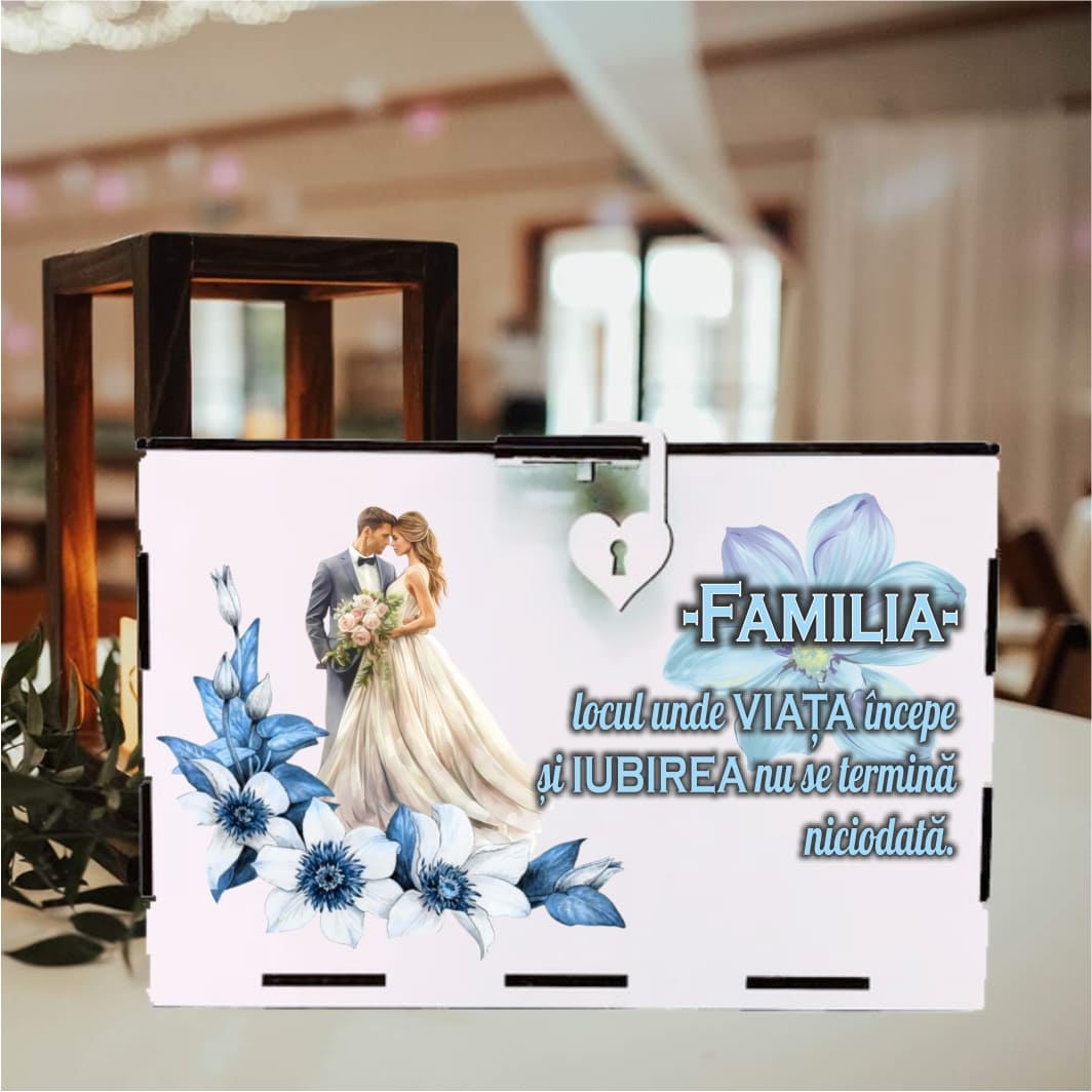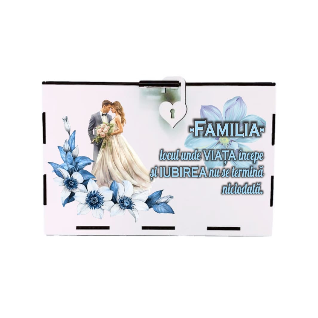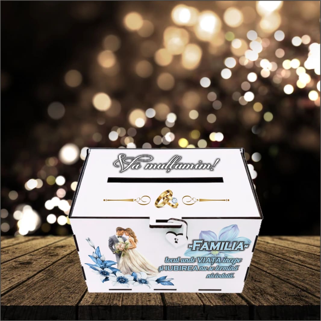 Cutie alba pentru darul de nunta realizata din lemn si  printata UV.