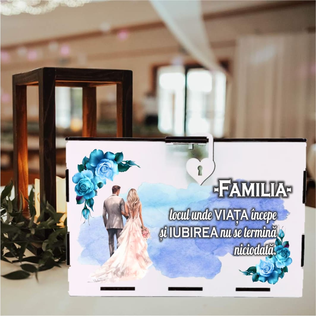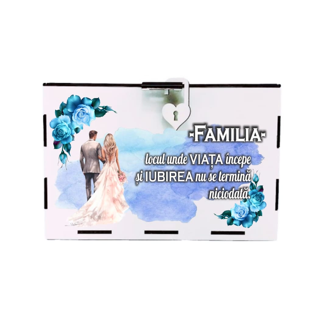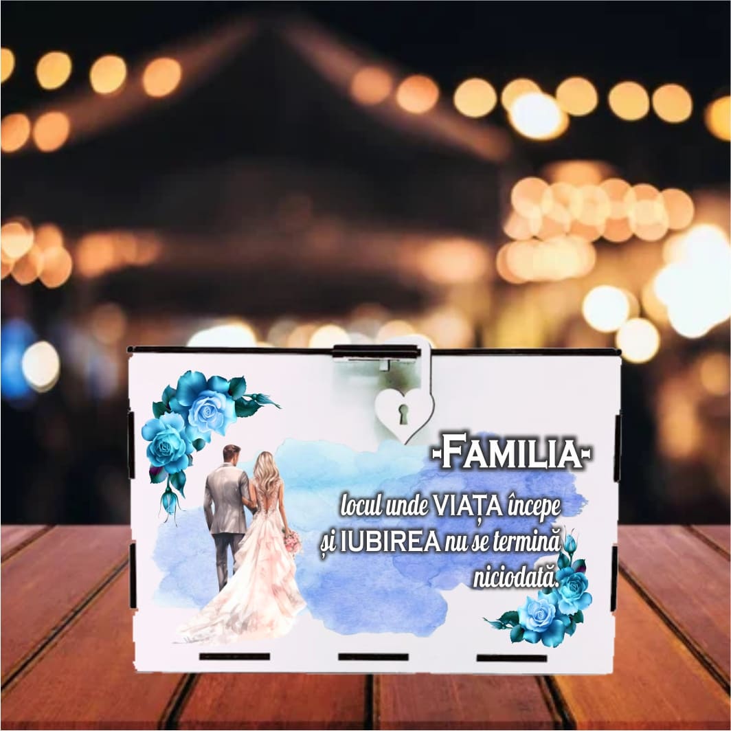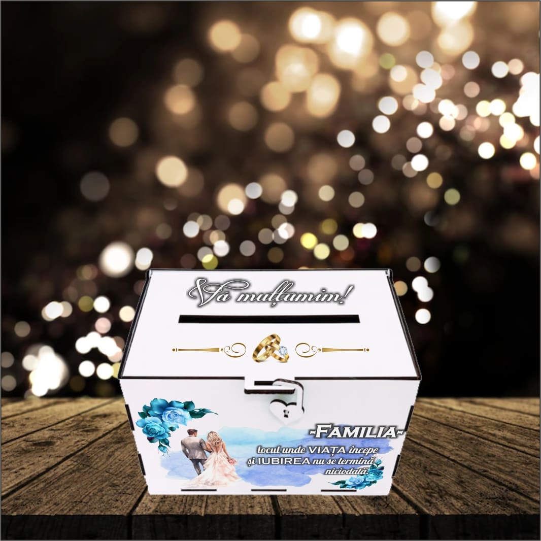 Cutie alba pentru darul de nunta realizata din lemn si  printata UV.