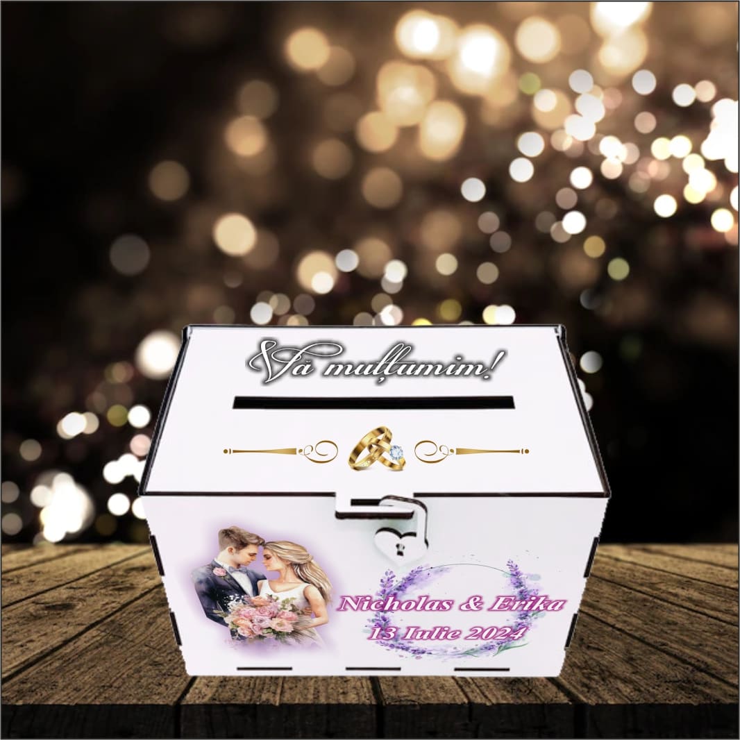 Cutie alba pentru darul de nunta realizata din lemn si personalizata cu numele mirilor si data evenimentului prin imprimare UV.