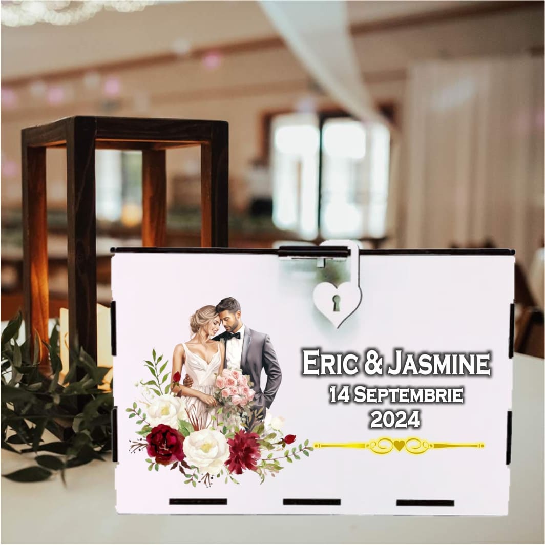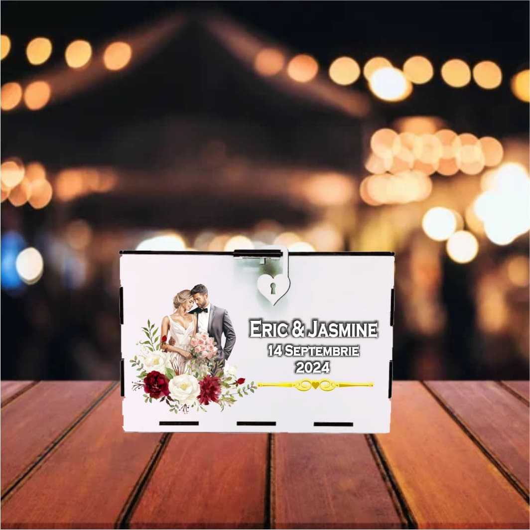 Cutie alba pentru darul de nunta realizata din lemn si personalizata cu numele mirilor si data evenimentului prin imprimare UV.