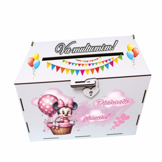 Cutie de bani pentru botez, Roz, Minnie Mouse, Lemn, 30x20x20 cm, CDBUV010