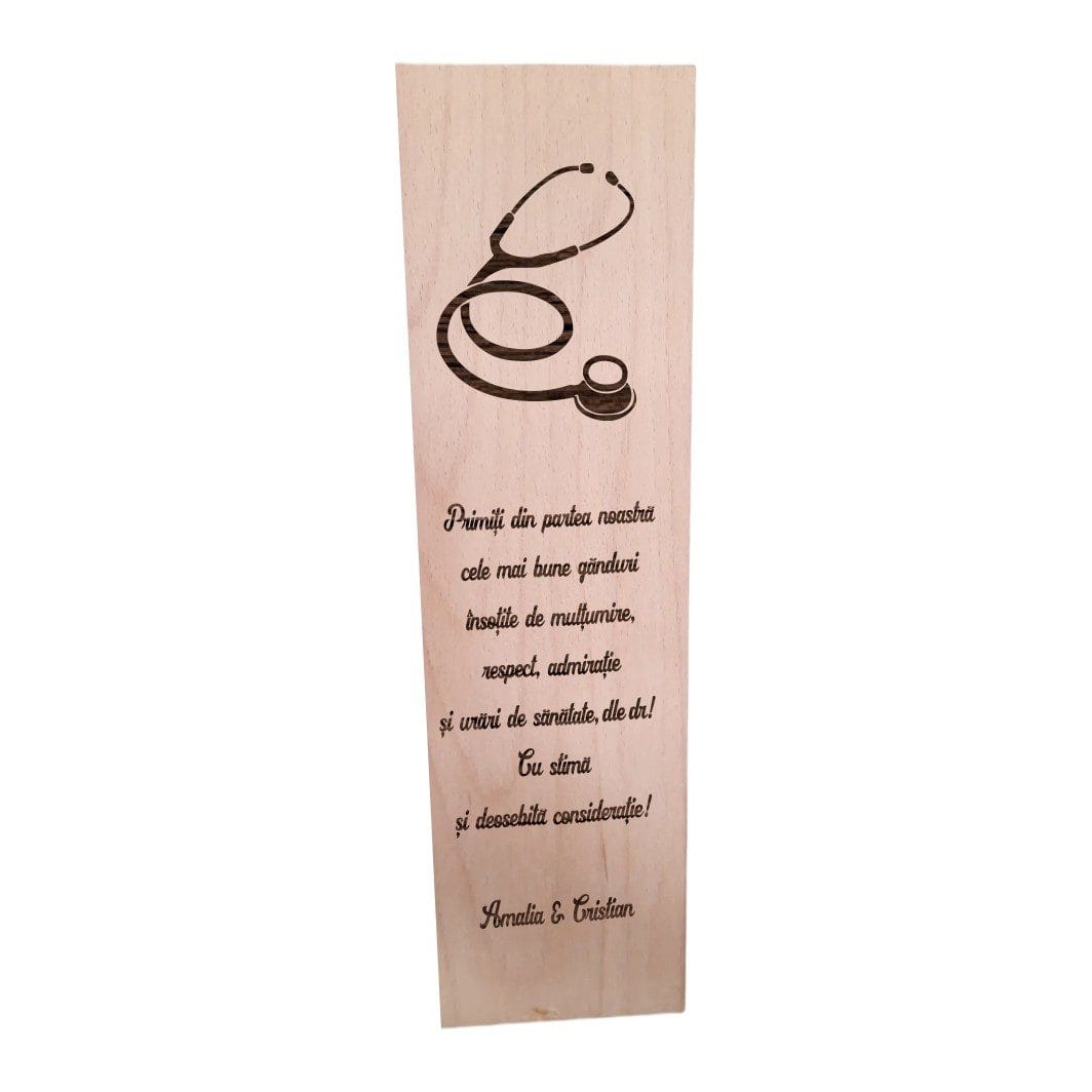 Cutie pentru sticla de vin cu mesaj pentru doctor.