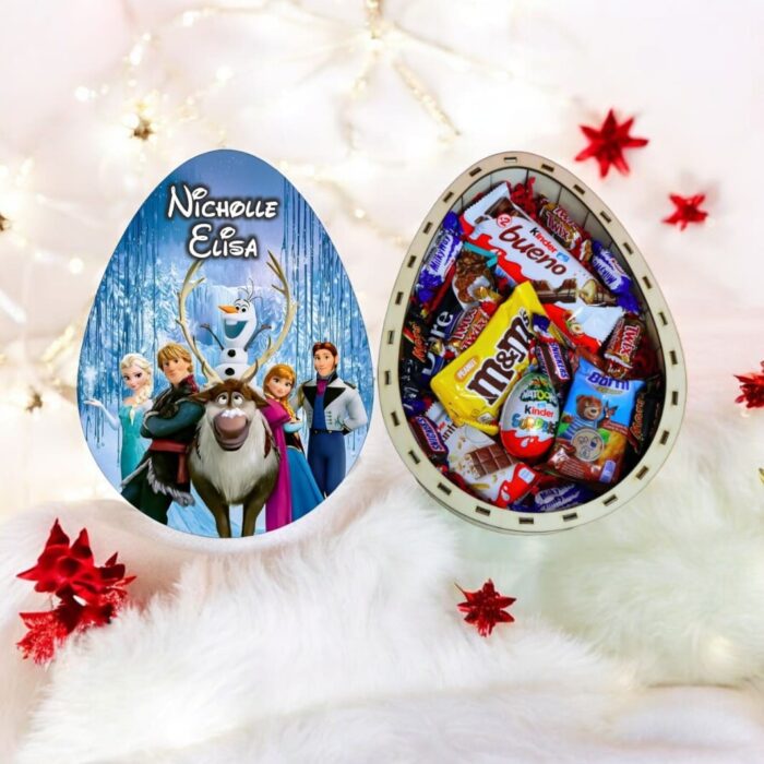 Această cutie dulciuri Crăciun personalizată în formă de Ou Kinder, Model Frozen este alegerea perfectă pentru cei care doresc să dăruiască un cadou special, elegant și personal.