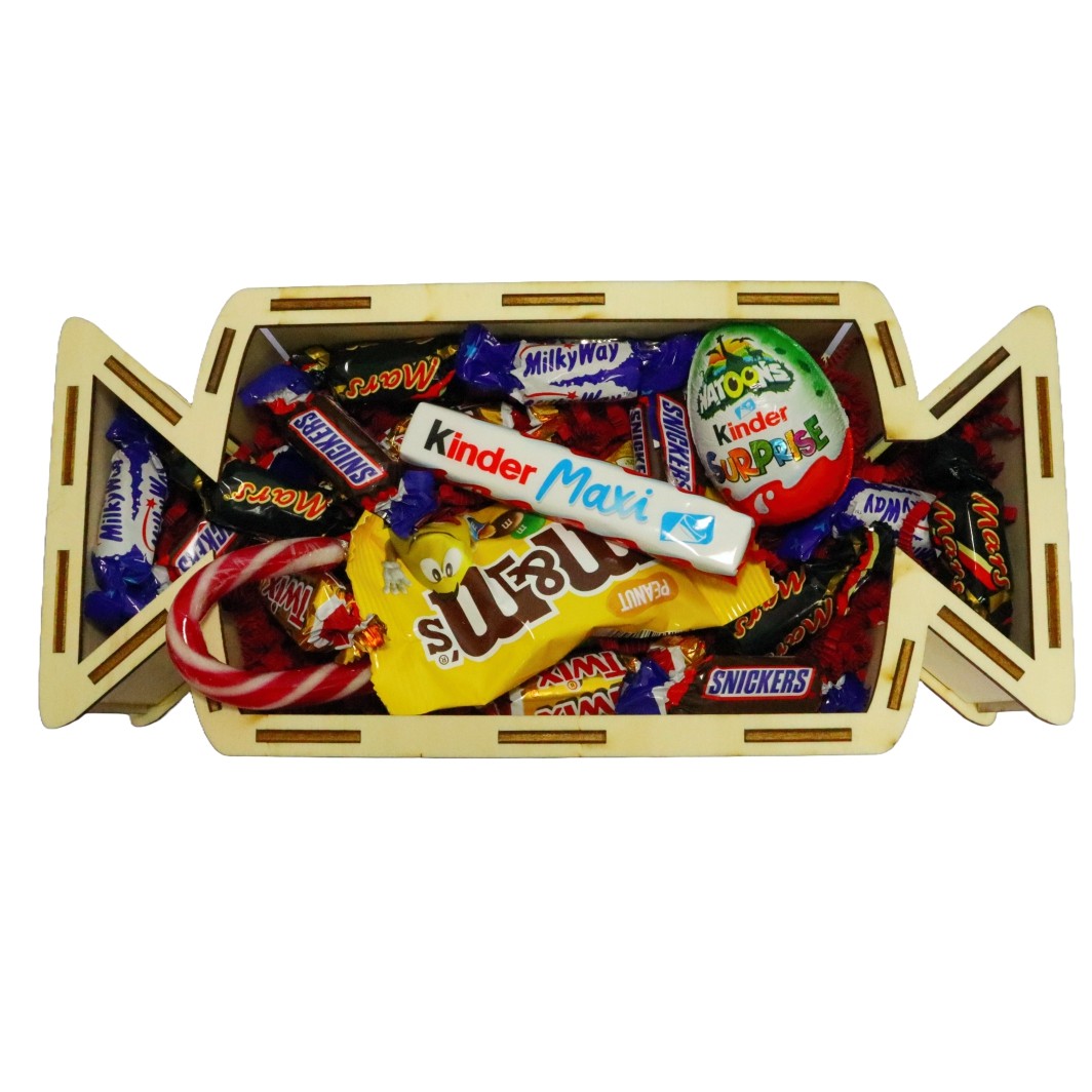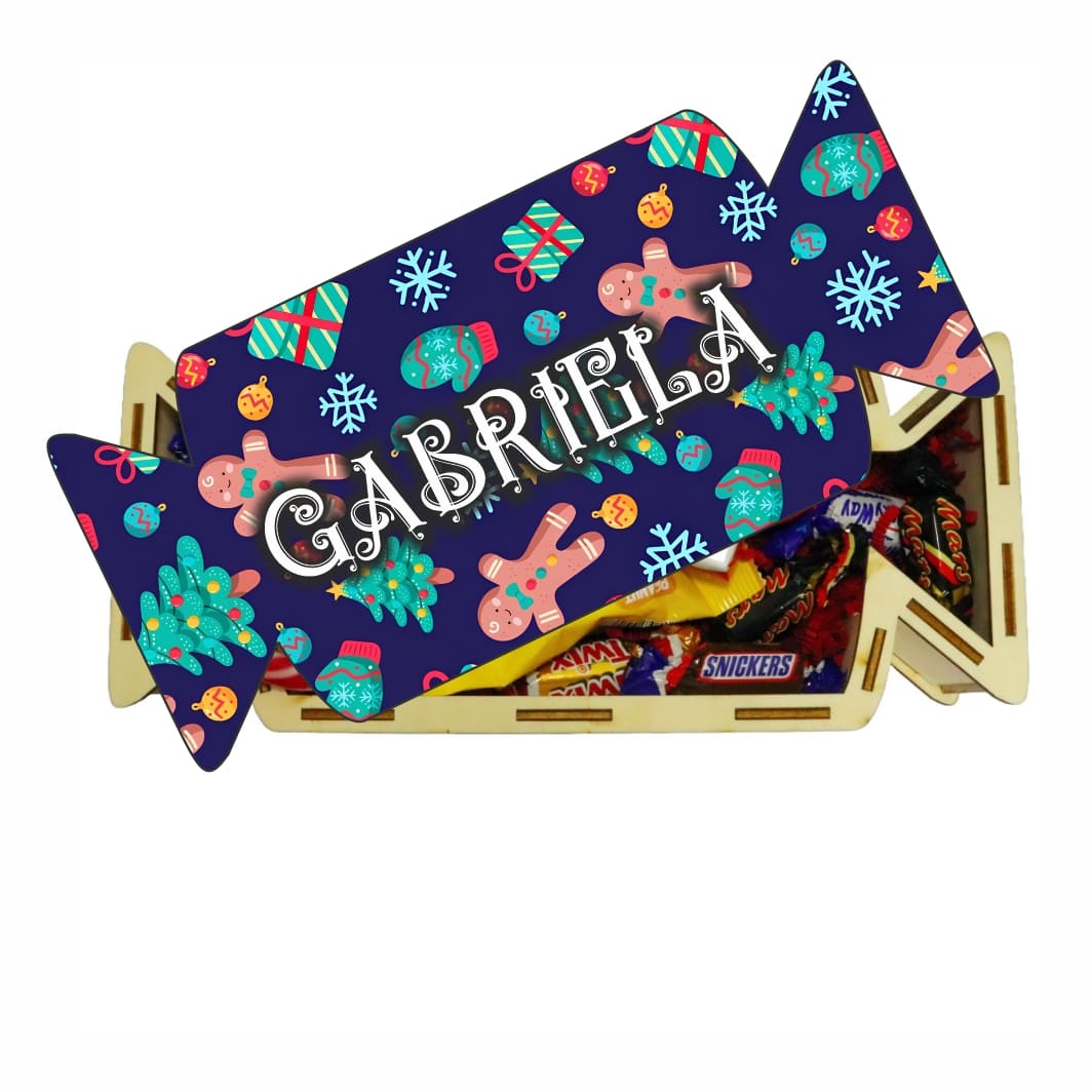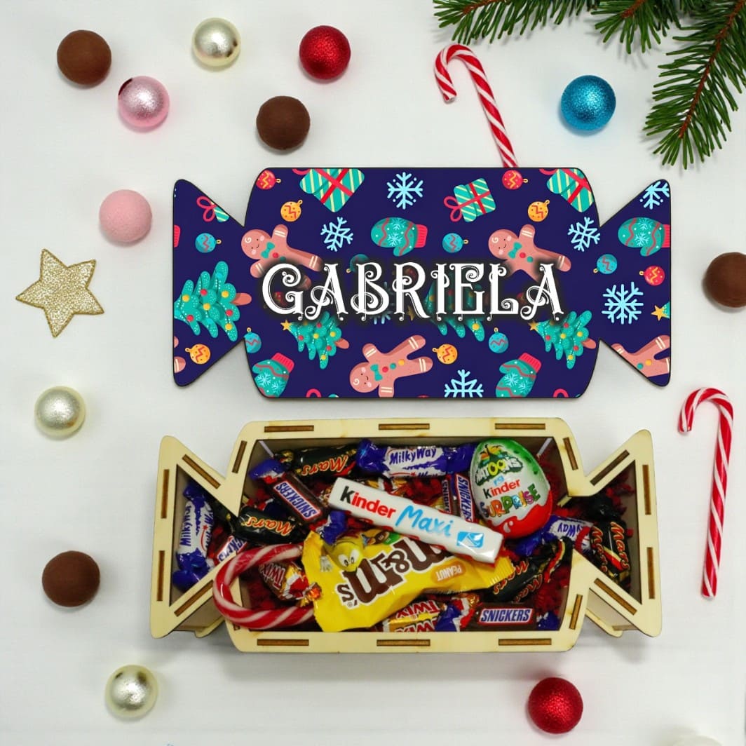 Această cutie dulciuri Crăciun personalizată în formă de bomboană decorată cu Cadouri este realizată din placaj de plop de 4 mm, imprimată cu print UV de înaltă calitate și completată de dulciuri diverse ce aduc zâmbete copiilor.