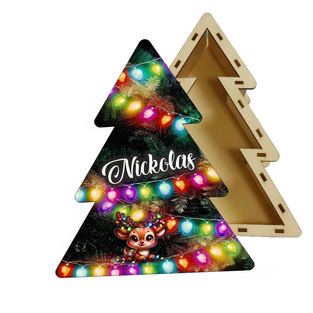 Cutia Dulciuri Crăciun, Personalizată, Brad, Ren, Lemn, 27x22cm, CCDB012 este combinația perfectă între tradiție, calitate și emoție. Fabricată din lemn de plop, imprimată UV și personalizată cu numele copilului, această cutie este un cadou care aduce zâmbete, culoare și magie sub bradul de Crăciun.