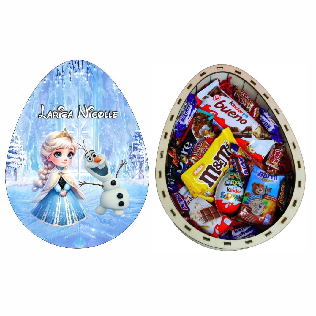 Această cutie dulciuri Crăciun personalizată în formă de Ou Kinder, Elsa este alegerea perfectă pentru cei care doresc să dăruiască un cadou special, elegant și personal.
