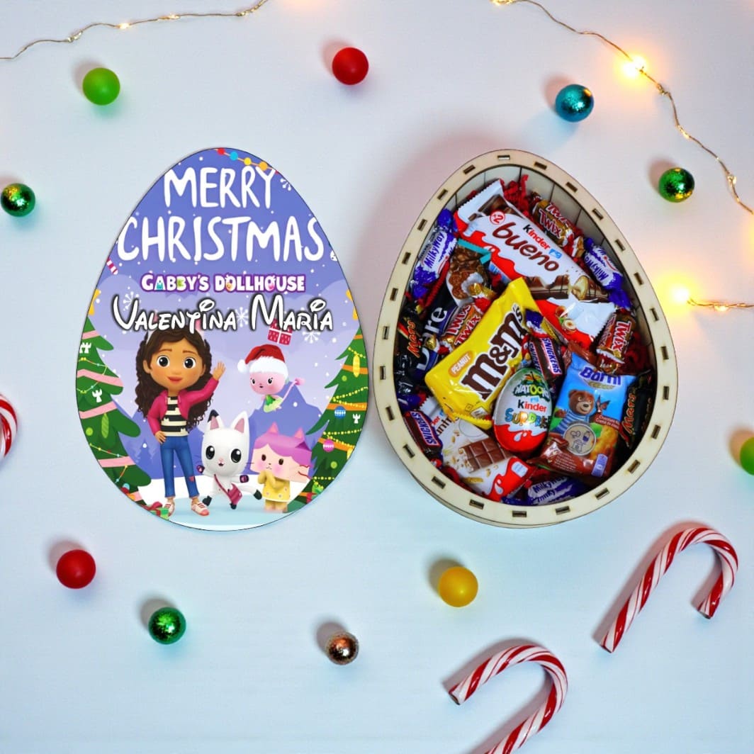 Această cutie dulciuri Crăciun personalizată în formă de Ou Kinder, Gabby este alegerea perfectă pentru cei care doresc să dăruiască un cadou special, elegant și personal.