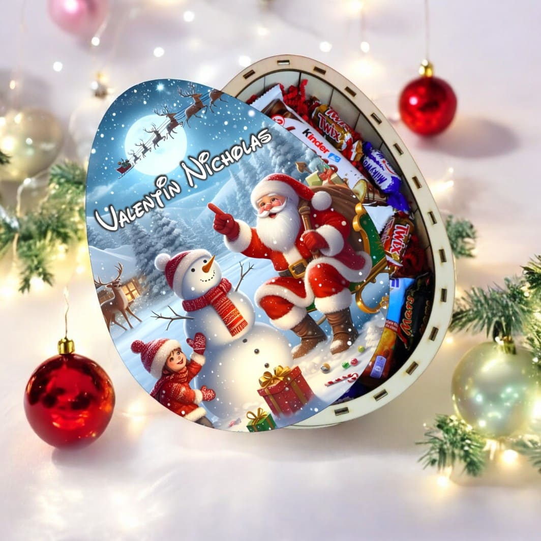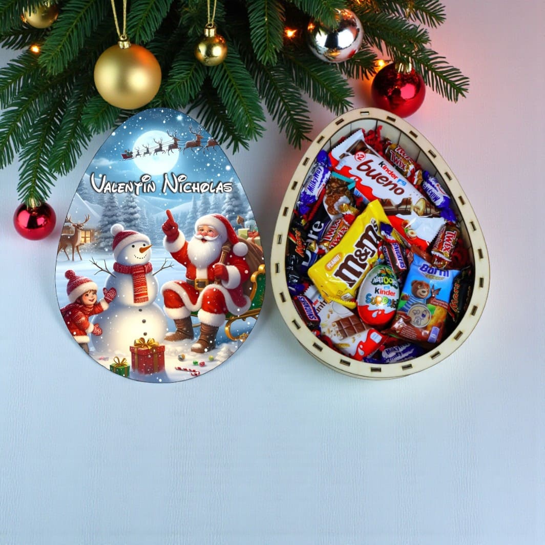 Această cutie dulciuri Crăciun personalizată în formă de Ou Kinder, Mos, Iarna este alegerea perfectă pentru cei care doresc să dăruiască un cadou special, elegant și personal.