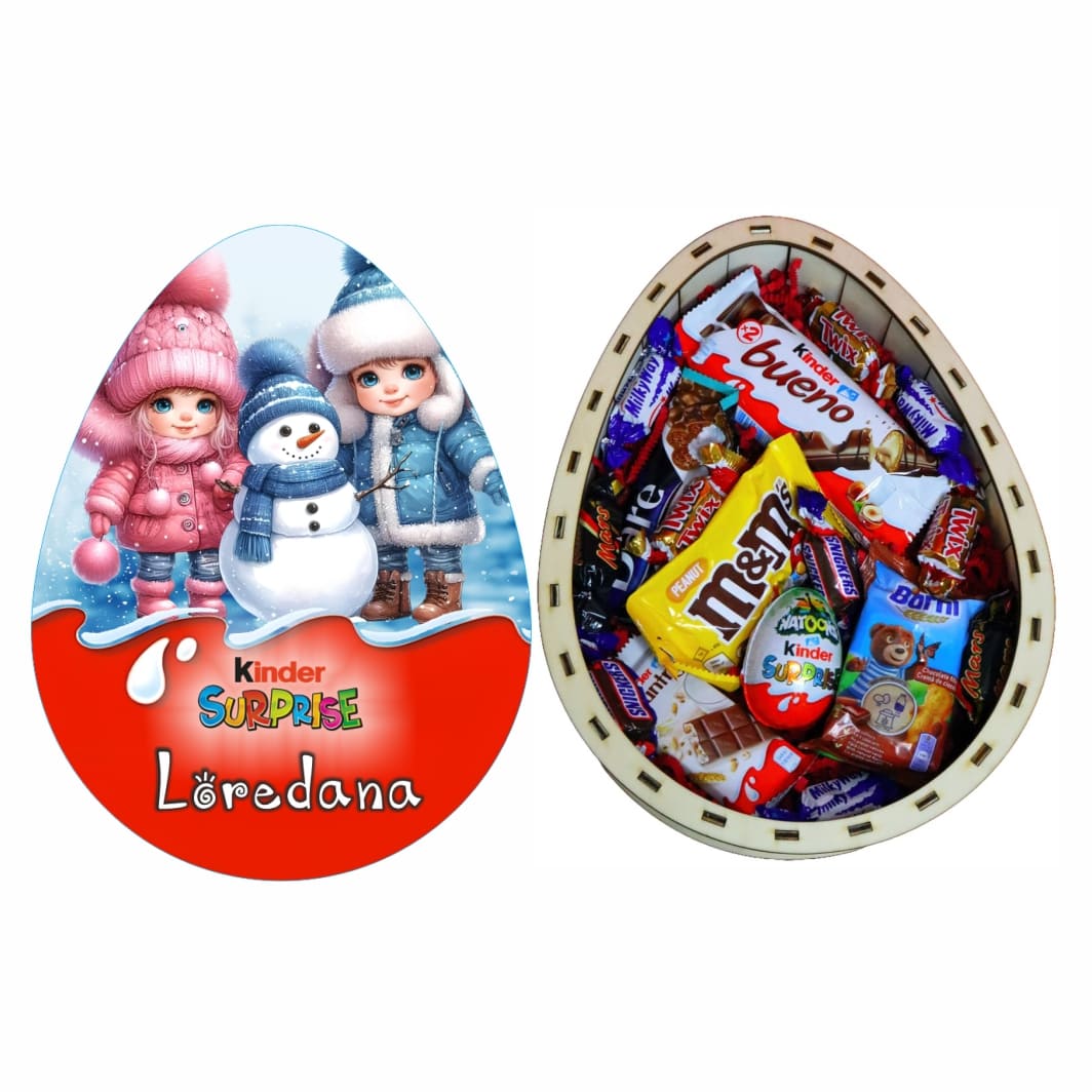 Această cutie dulciuri Crăciun personalizată în formă de Ou Kinder, Om Zapada este alegerea perfectă pentru cei care doresc să dăruiască un cadou special, elegant și personal.