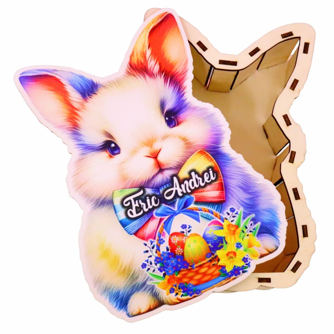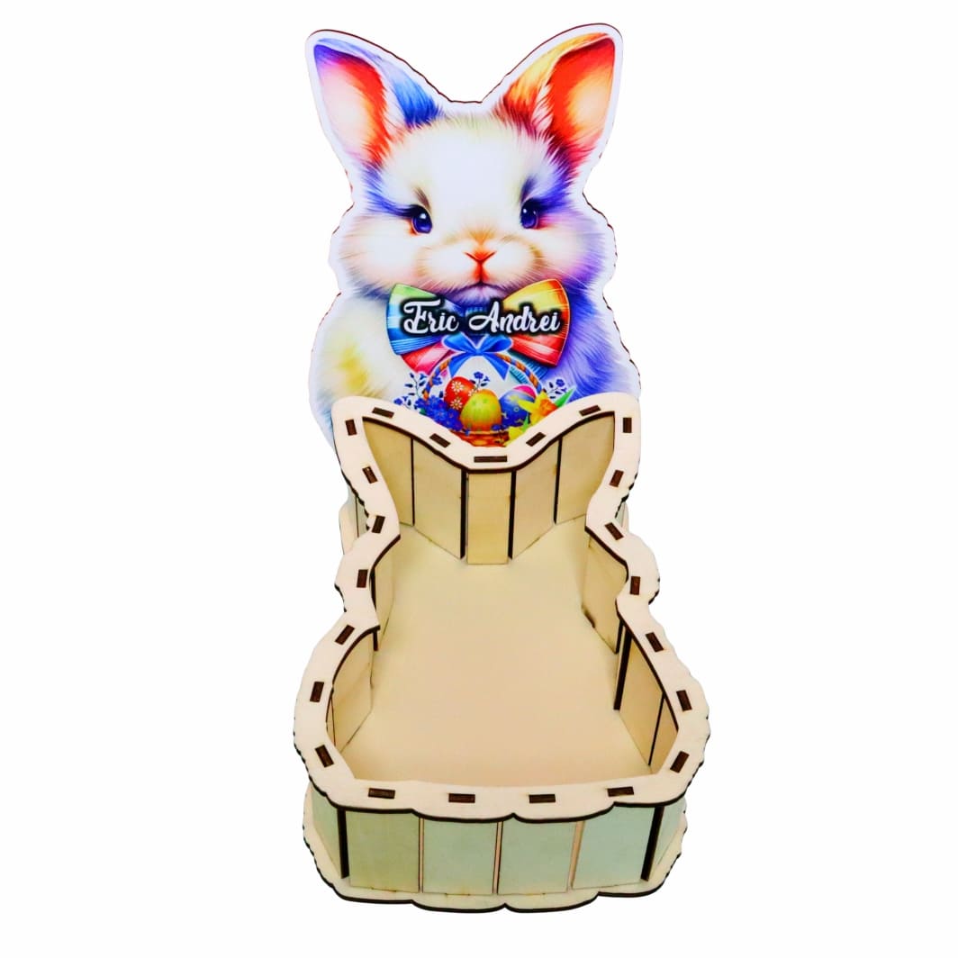 Descoperă cutia tematică de Paște personalizată, un cadou minunat ce aduce bucurie în sufletul copiilor! Această cutie tematică Paște, în formă de iepuraș adorabil, este decorată cu culori vesele și poate fi personalizată cu numele copilului, transformând-o într-un obiect cu adevărat special. Fă-i sărbătorile mai frumoase și memorabile cu un dar unic!