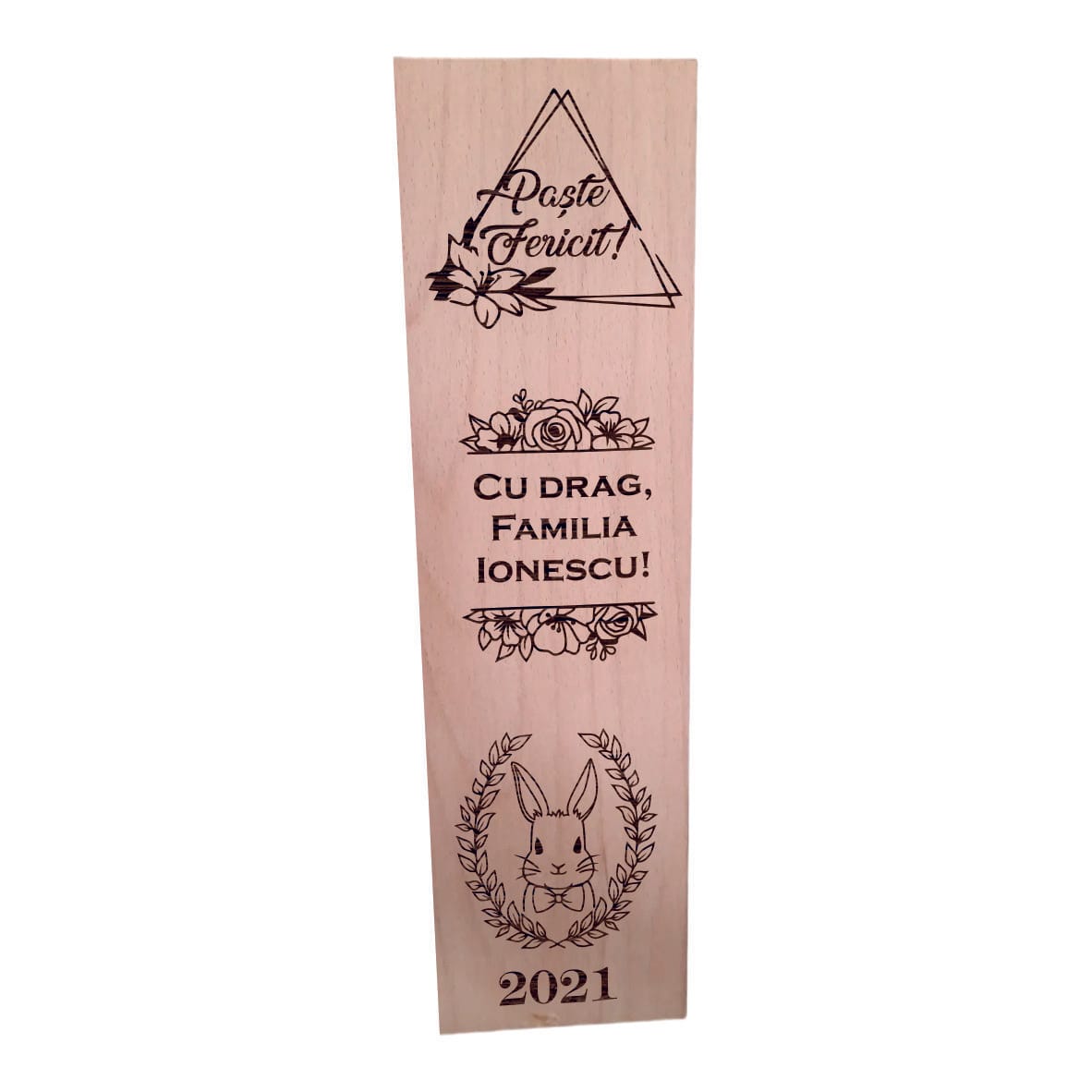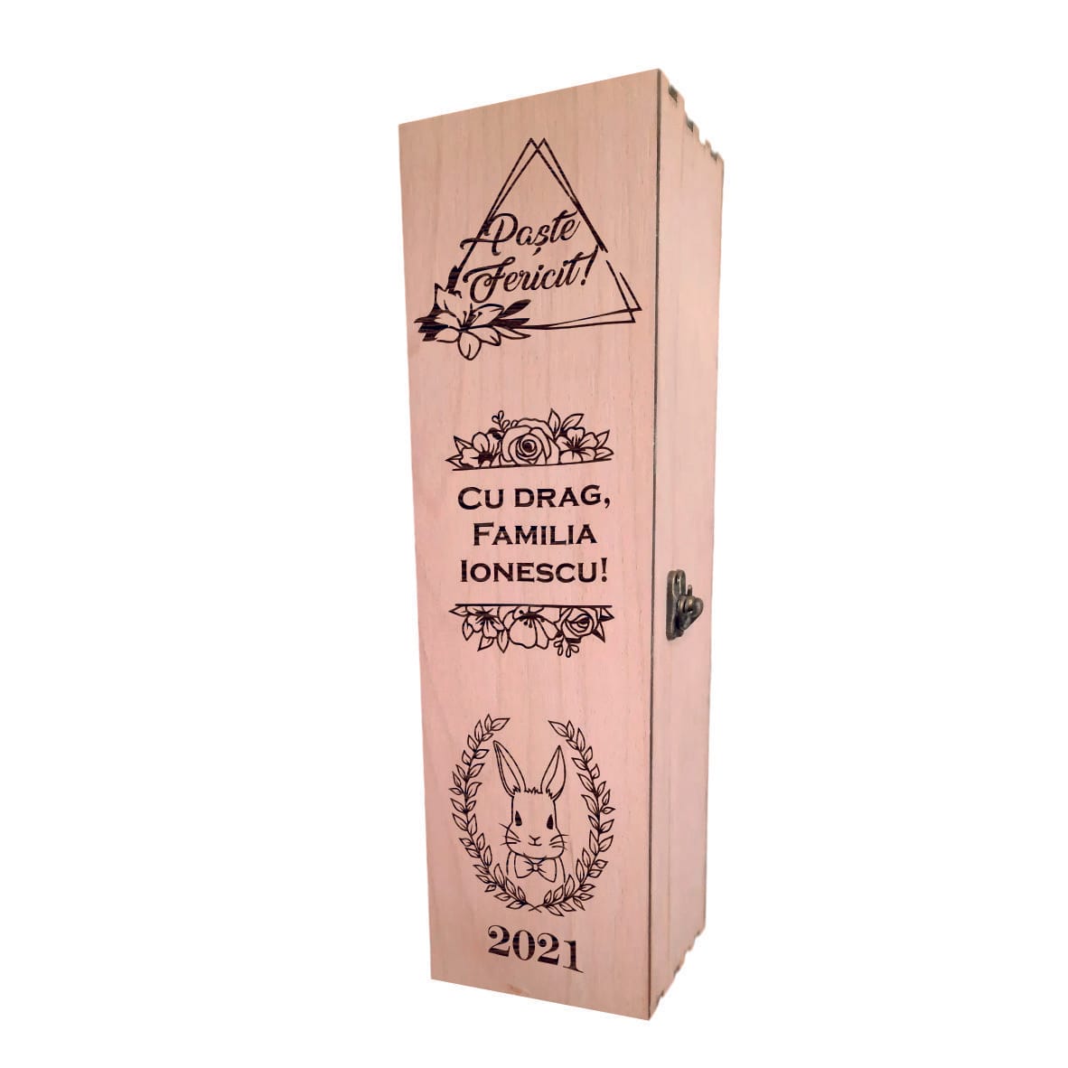 Această cutie vin personalizată din lemn este alegerea ideală atunci când dorești să oferi un cadou rafinat, cu semnificație și impact vizual, mai ales în perioada sărbătorilor pascale. Realizată cu atenție la detalii, cutia îmbină utilitatea practică cu eleganța unui obiect decorativ, fiind potrivită atât pentru a proteja sticla de vin, cât și pentru a impresiona prin design și mesaj.